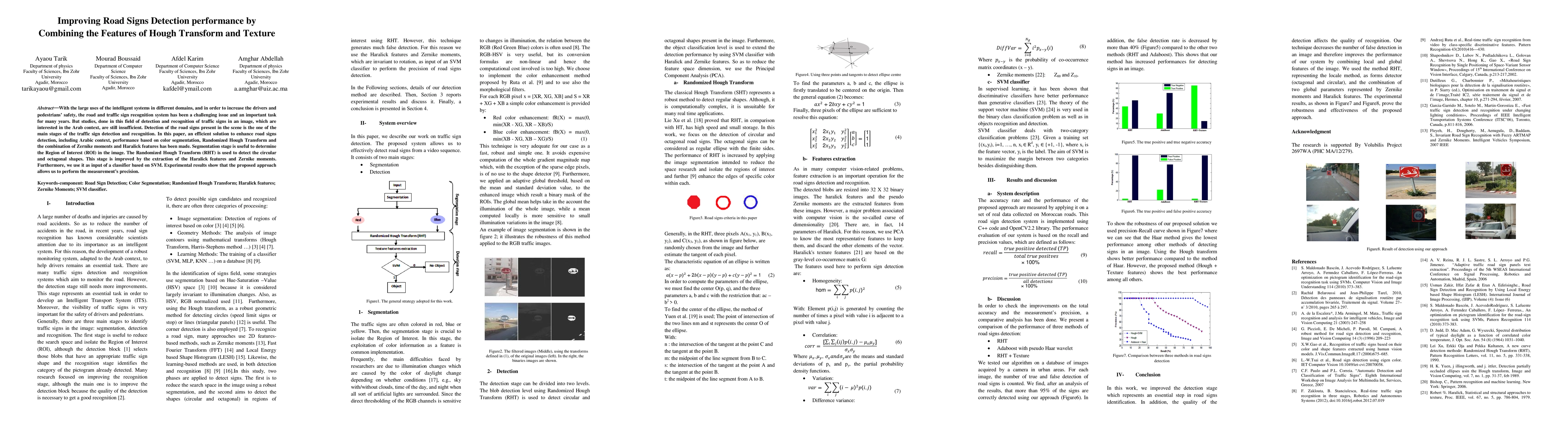 With the large uses of the intelligent systems in different domains, and in order to increase the drivers and pedestrians safety, the road and traffic sign recognition system has been a challenging issue and an important task for many years. But studies, done in this field of detection and recognition of traffic signs in an image, which are interested in the Arab context, are still insufficient. Detection of the road signs present in the scene is the one of the main stages of the traffic sign detection and recognition. In this paper, an efficient solution to enhance road signs detection, including Arabic context, performance based on color segmentation, Randomized Hough Transform and the combination of Zernike moments and Haralick features has been made. Segmentation stage is useful to determine the Region of Interest (ROI) in the image. The Randomized Hough Transform (RHT) is used to detect the circular and octagonal shapes. This stage is improved by the extraction of the Haralick features and Zernike moments. Furthermore, we use it as input of a classifier based on SVM. Experimental results show that the proposed approach allows us to perform the measurements precision.