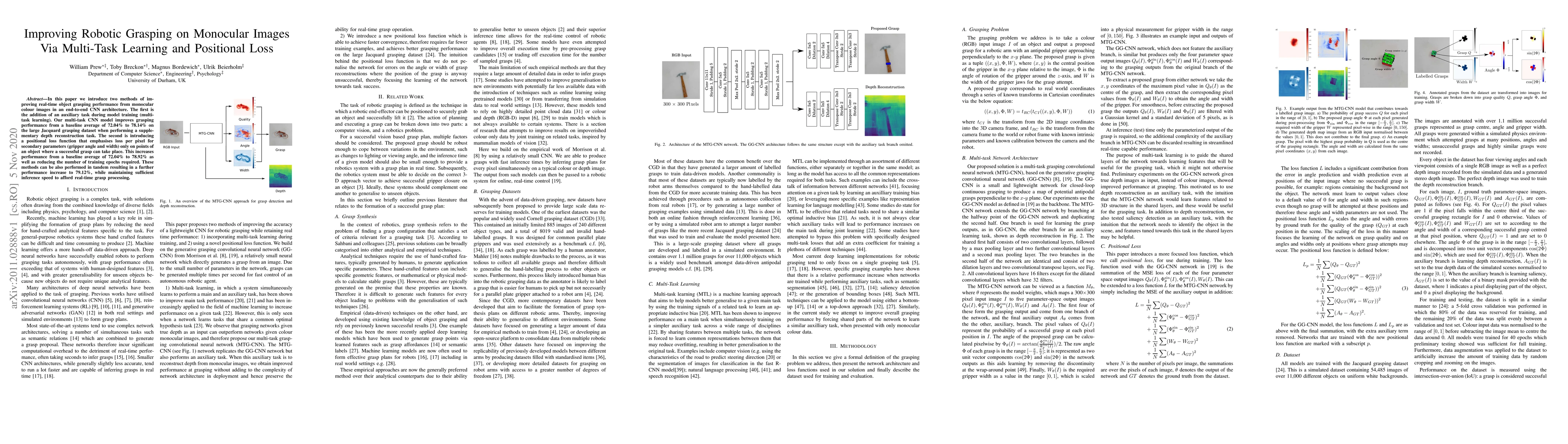 In this paper, we introduce two methods of improving real-time object grasping performance from monocular colour images in an end-to-end CNN architecture. The first is the addition of an auxiliary task during model training (multi-task learning). Our multi-task CNN model improves grasping performance from a baseline average of 72.04% to 78.14% on the large Jacquard grasping dataset when performing a supplementary depth reconstruction task. The second is introducing a positional loss function that emphasises loss per pixel for secondary parameters (gripper angle and width) only on points of an object where a successful grasp can take place. This increases performance from a baseline average of 72.04% to 78.92% as well as reducing the number of training epochs required. These methods can be also performed in tandem resulting in a further performance increase to 79.12% while maintaining sufficient inference speed to afford real-time grasp processing.