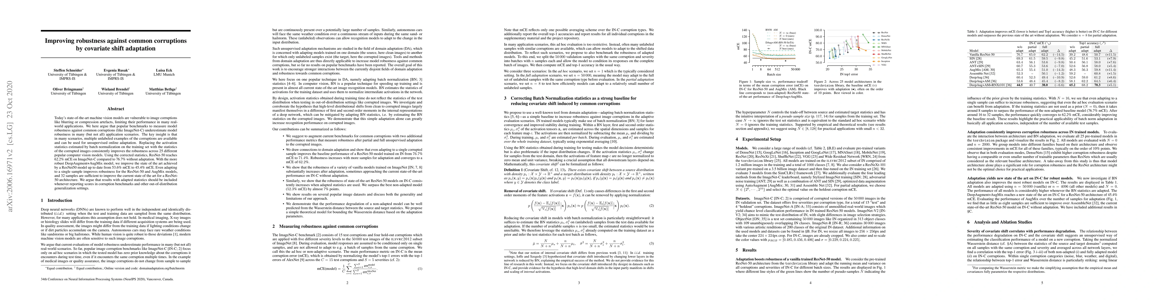 This paper explores improving machine vision models' robustness to common corruptions through covariate shift adaptation, demonstrating that using unlabeled corrupted images for unsupervised online adaptation enhances model performance. The study shows significant improvements across various models, including ResNet-50 and DeepAugment+AugMix, and argues for including adapted statistics in benchmark reporting.
