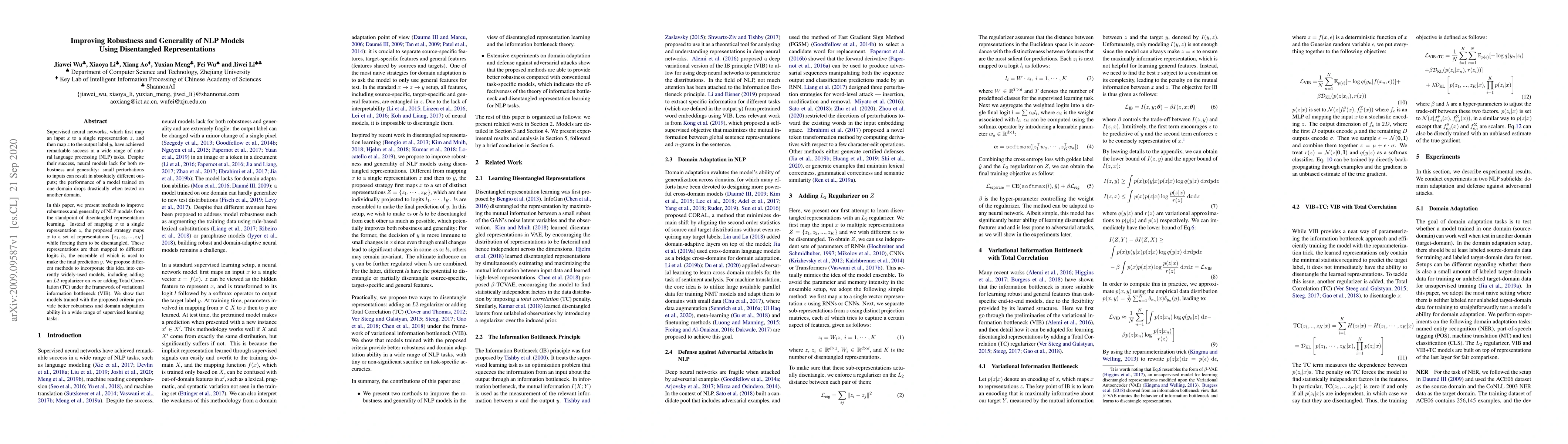 This paper proposes methods to enhance the robustness and generality of NLP models through disentangled representation learning. It introduces a strategy where inputs are mapped to multiple disentangled representations, which are then used to make predictions, improving performance across different domains.