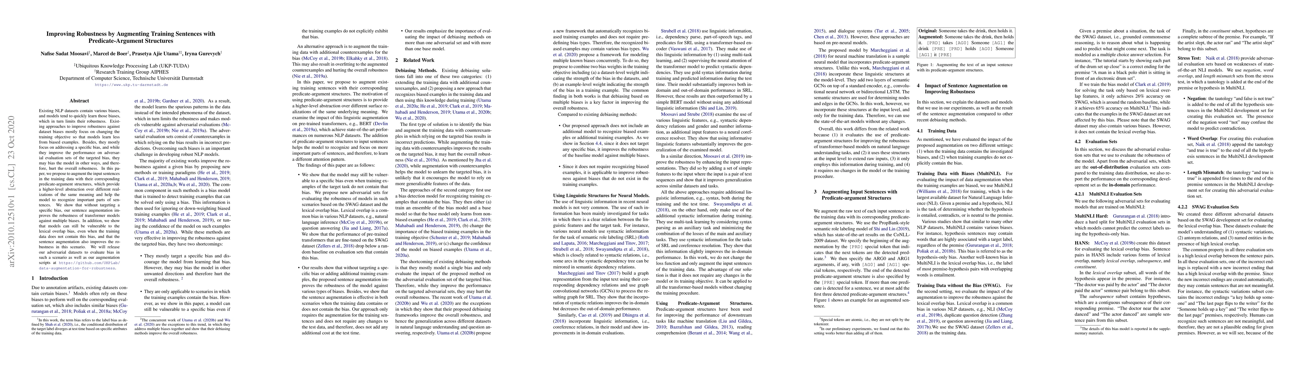 This research proposes augmenting training sentences in NLP models with their predicate-argument structures to improve robustness against various biases. The method effectively enhances model performance on multiple biases without targeting specific ones, and also aids in resisting lexical overlap bias, even when the training data lacks it. The authors will release their adversarial datasets and augmentation scripts for further evaluation.