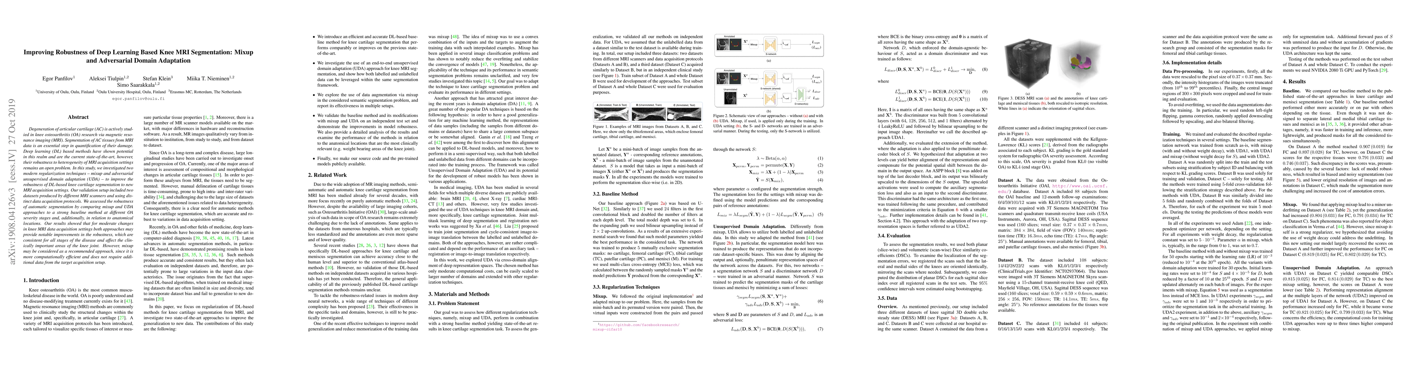 This study investigates mixup and adversarial domain adaptation to enhance the robustness of deep learning-based knee cartilage segmentation under varying MRI acquisition conditions. The results indicate both methods improve segmentation robustness, with mixup being more efficient and recommended for practical applications.