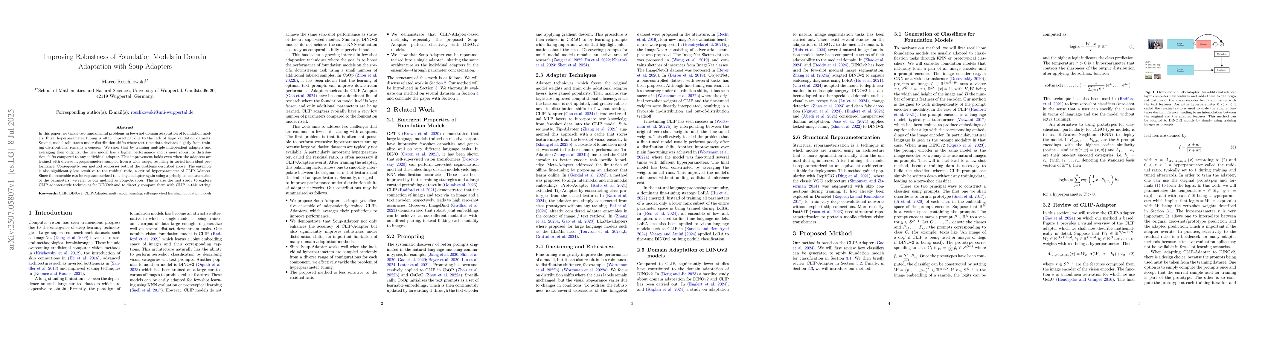 In this paper, we tackle two fundamental problems in few-shot domain adaptation of foundation models. First, hyperparameter tuning is often impractical due to the lack of large validation datasets. Second, model robustness under distribution shifts where test time data deviates slightly from training distributions, remains a concern. We show that by training multiple independent adapters and averaging their outputs, the new model has a higher performance and is more robust to distribution shifts compared to any individual adapter. This improvement holds even when the adapters are trained with diverse hyperparameters sampled from a wide range, resulting in varied individual performance. Consequently, our method addresses both of the problems described above. The ensemble is also significantly less sensitive to the residual ratio, a critical hyperparameter of CLIP-Adapter. Since the ensemble can be reparameterized to a single adapter again using a principled concatenation of the parameters, we refer to our method as Soup-Adapter. This is also the first study to explore CLIP adapter-style techniques for DINOv2 and to directly compare them with CLIP in this setting.