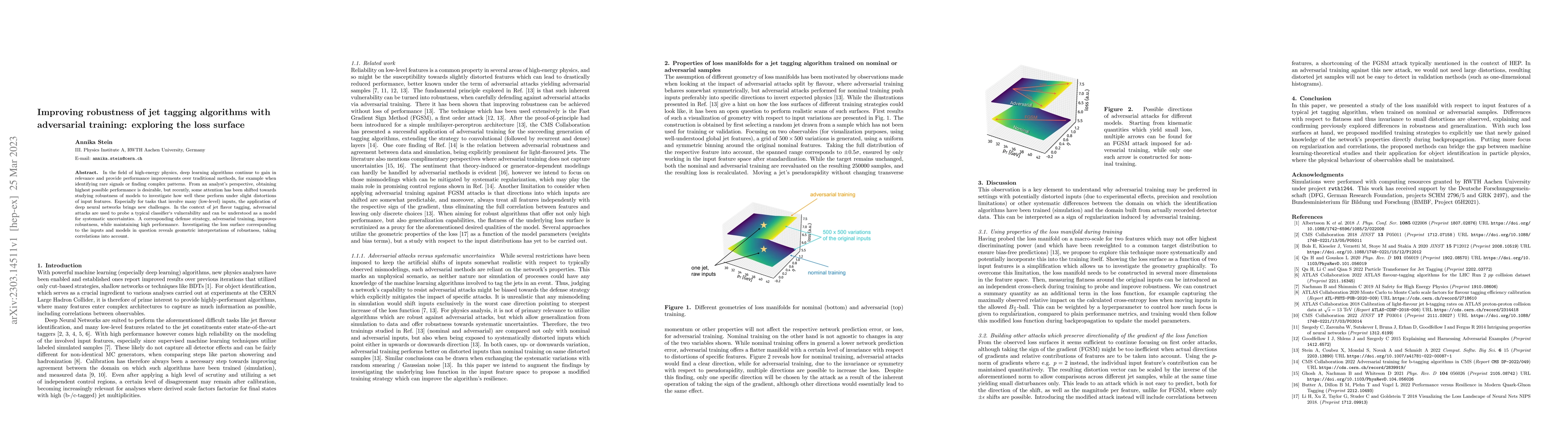 The research investigates the robustness of jet tagging algorithms in high-energy physics using adversarial training, exploring the loss surface geometry to understand and improve model resilience to input distortions.