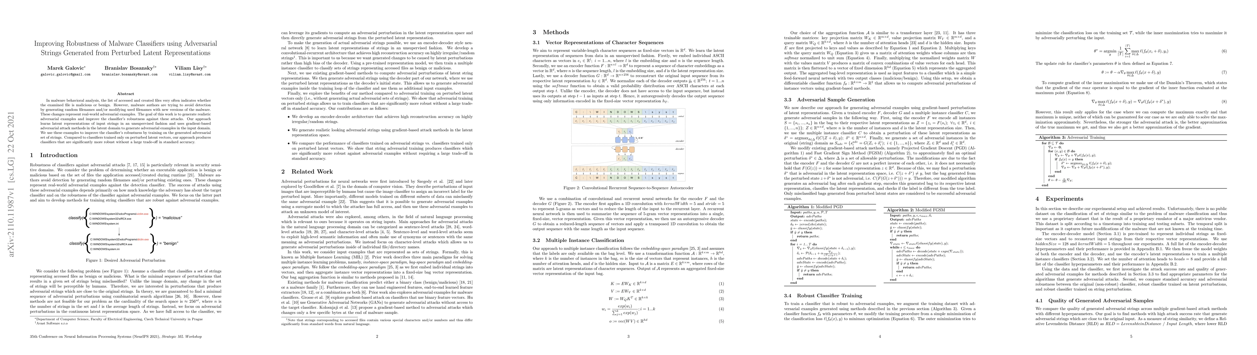 This paper proposes a method to enhance malware classifiers' robustness by generating adversarial examples using perturbed latent representations of filenames. The approach trains classifiers on these examples, resulting in improved resilience against adversarial attacks without significantly compromising standard accuracy.