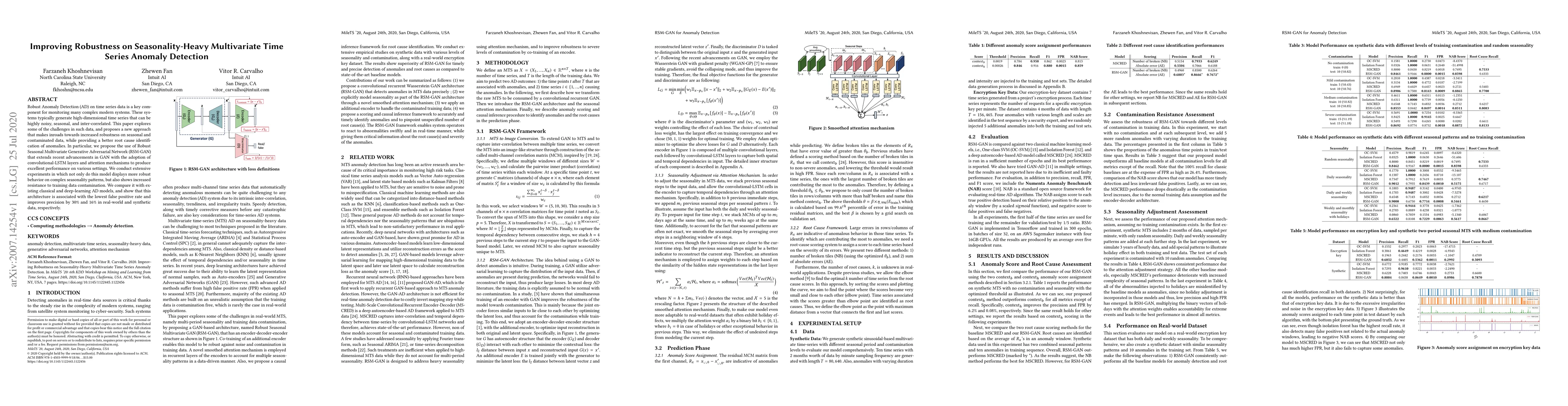 Robust Anomaly Detection (AD) on time series data is a key component for monitoring many complex modern systems. These systems typically generate high-dimensional time series that can be highly noisy, seasonal, and inter-correlated. This paper explores some of the challenges in such data, and proposes a new approach that makes inroads towards increased robustness on seasonal and contaminated data, while providing a better root cause identification of anomalies. In particular, we propose the use of Robust Seasonal Multivariate Generative Adversarial Network (RSM-GAN) that extends recent advancements in GAN with the adoption of convolutional-LSTM layers and attention mechanisms to produce excellent performance on various settings. We conduct extensive experiments in which not only do this model displays more robust behavior on complex seasonality patterns, but also shows increased resistance to training data contamination. We compare it with existing classical and deep-learning AD models, and show that this architecture is associated with the lowest false positive rate and improves precision by 30% and 16% in real-world and synthetic data, respectively.