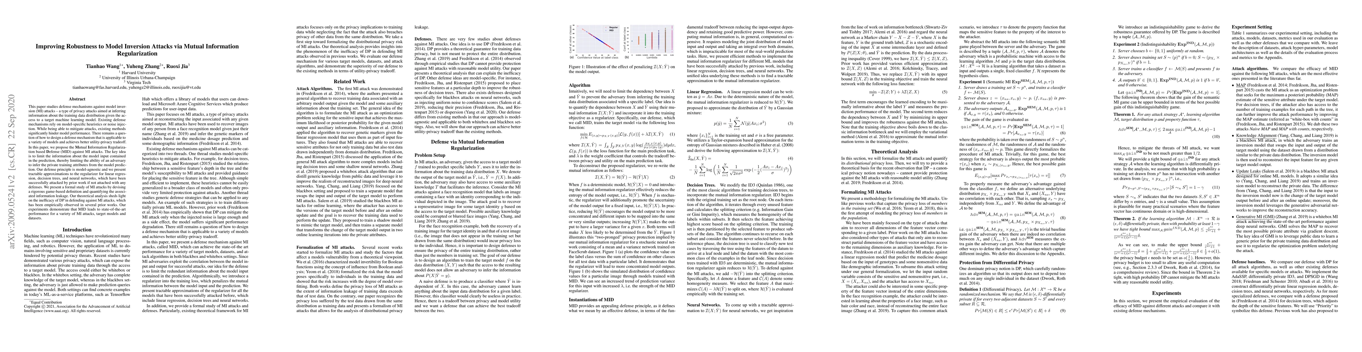 This paper proposes Mutual Information Regularization based Defense (MID) to combat model inversion attacks, aiming to limit information leakage from model predictions. The defense is model-agnostic and achieves better utility-privacy tradeoffs compared to existing methods, as demonstrated through theoretical analysis and empirical results.