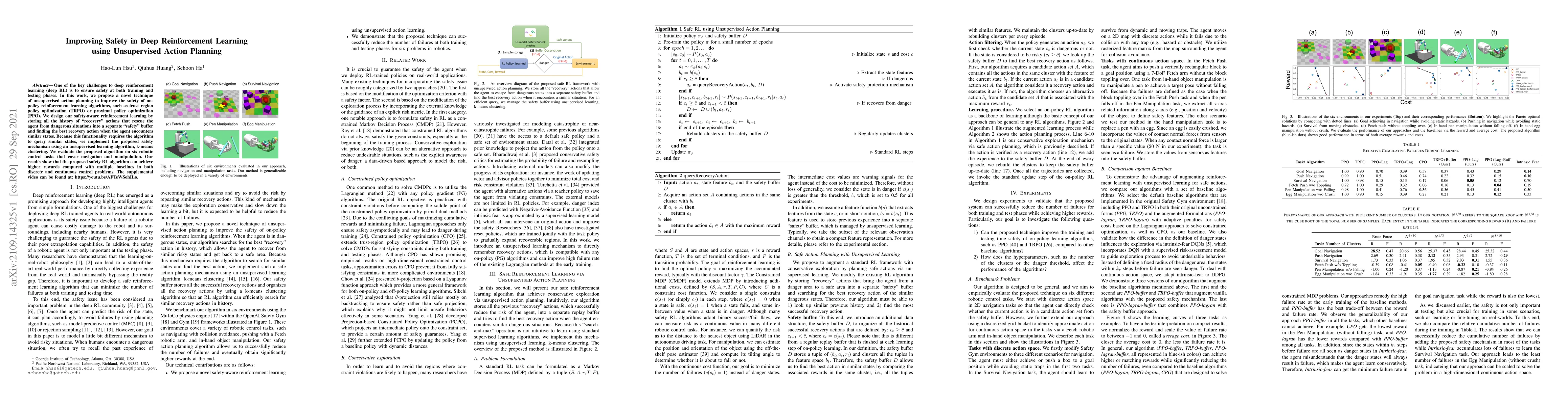 This paper proposes a novel unsupervised action planning technique to enhance safety in on-policy deep reinforcement learning algorithms. It uses k-means clustering to store and retrieve recovery actions from a "safety" buffer, thereby improving safety and performance across various robotic control tasks.
