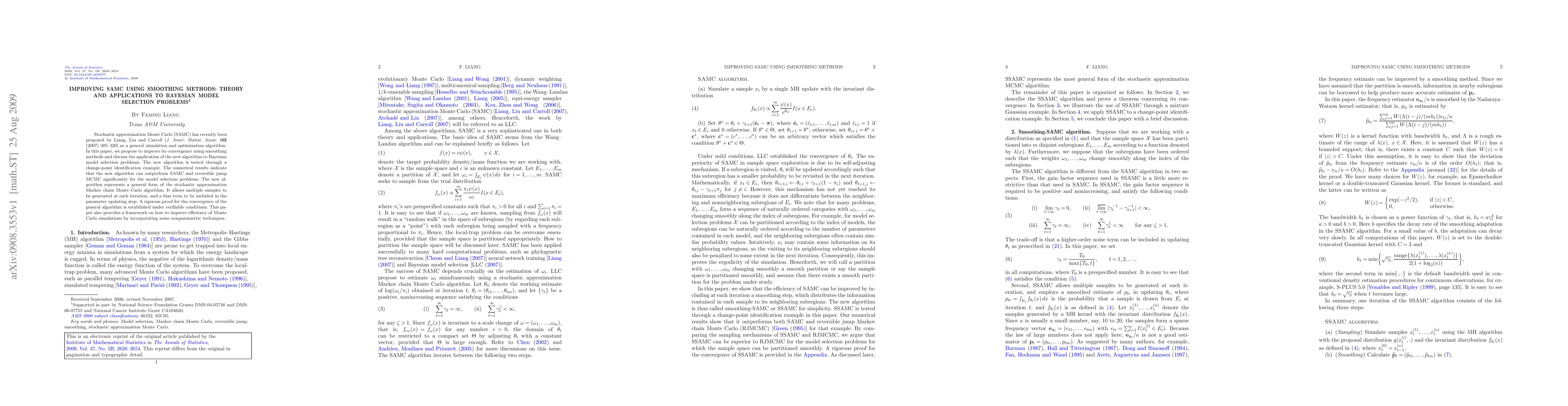 Stochastic approximation Monte Carlo (SAMC) has recently been proposed by Liang, Liu and Carroll [J. Amer. Statist. Assoc. 102 (2007) 305--320] as a general simulation and optimization algorithm. In this paper, we propose to improve its convergence using smoothing methods and discuss the application of the new algorithm to Bayesian model selection problems. The new algorithm is tested through a change-point identification example. The numerical results indicate that the new algorithm can outperform SAMC and reversible jump MCMC significantly for the model selection problems. The new algorithm represents a general form of the stochastic approximation Markov chain Monte Carlo algorithm. It allows multiple samples to be generated at each iteration, and a bias term to be included in the parameter updating step. A rigorous proof for the convergence of the general algorithm is established under verifiable conditions. This paper also provides a framework on how to improve efficiency of Monte Carlo simulations by incorporating some nonparametric techniques.