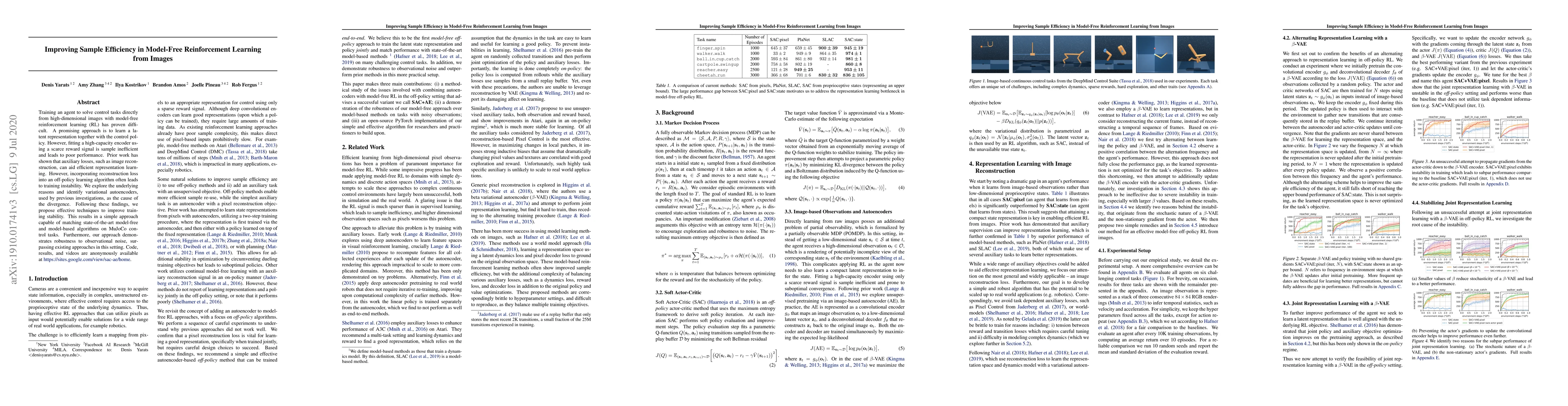 Training an agent to solve control tasks directly from high-dimensional images with model-free reinforcement learning (RL) has proven difficult. A promising approach is to learn a latent representation together with the control policy. However, fitting a high-capacity encoder using a scarce reward signal is sample inefficient and leads to poor performance. Prior work has shown that auxiliary losses, such as image reconstruction, can aid efficient representation learning. However, incorporating reconstruction loss into an off-policy learning algorithm often leads to training instability. We explore the underlying reasons and identify variational autoencoders, used by previous investigations, as the cause of the divergence. Following these findings, we propose effective techniques to improve training stability. This results in a simple approach capable of matching state-of-the-art model-free and model-based algorithms on MuJoCo control tasks. Furthermore, our approach demonstrates robustness to observational noise, surpassing existing approaches in this setting. Code, results, and videos are anonymously available at https://sites.google.com/view/sac-ae/home.