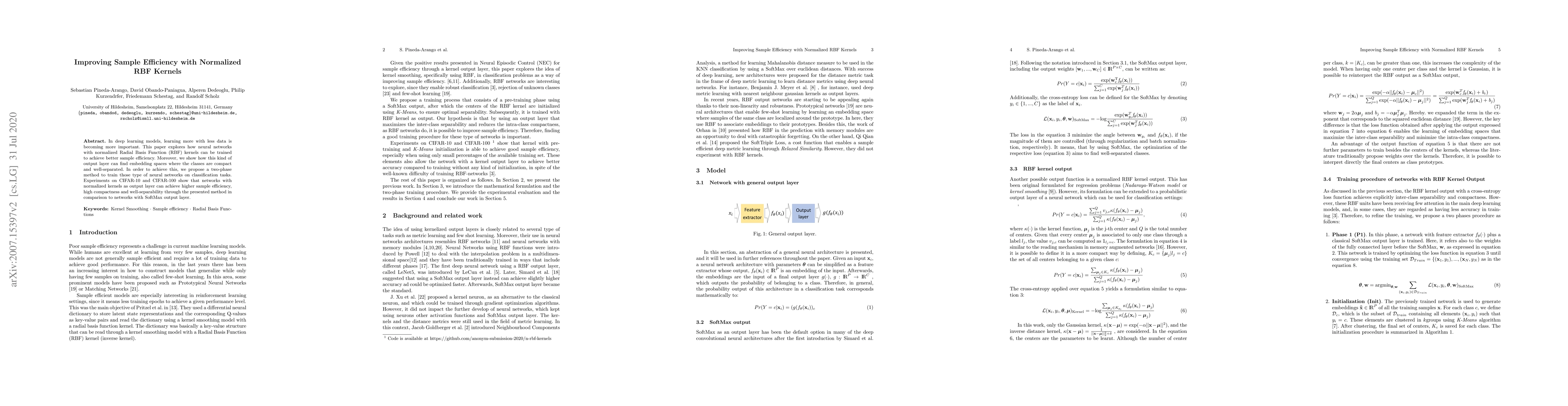 In deep learning models, learning more with less data is becoming more important. This paper explores how neural networks with normalized Radial Basis Function (RBF) kernels can be trained to achieve better sample efficiency. Moreover, we show how this kind of output layer can find embedding spaces where the classes are compact and well-separated. In order to achieve this, we propose a two-phase method to train those type of neural networks on classification tasks. Experiments on CIFAR-10 and CIFAR-100 show that networks with normalized kernels as output layer can achieve higher sample efficiency, high compactness and well-separability through the presented method in comparison to networks with SoftMax output layer.