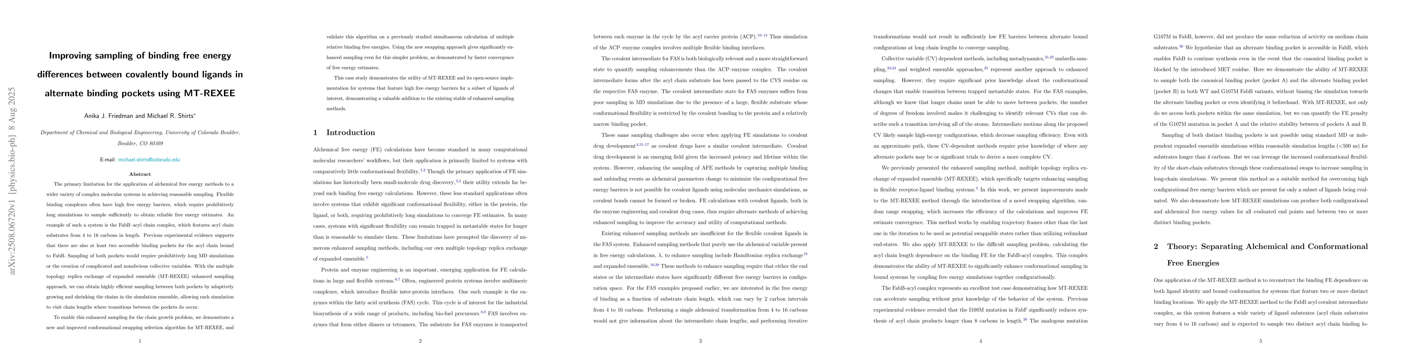 The primary limitation for the application of alchemical free energy methods to a wider variety of complex molecular systems in achieving reasonable sampling. Flexible binding complexes often have high free energy barriers, which require prohibitively long simulations to sample sufficiently to obtain reliable free energy estimates. An example of such a system is the FabB--acyl chain complex, which features acyl chain substrates from 4 to 16 carbons in length. Previous experimental evidence supports that there are also at least two accessible binding pockets for the acyl chain bound to FabB. Sampling of both pockets would require prohibitively long MD simulations or the creation of complicated and nonobvious collective variables. With the multiple topology replica exchange of expanded ensemble (MT-REXEE) enhanced sampling approach, we can obtain highly efficient sampling between both pockets by adaptively growing and shrinking the chains in the simulation ensemble, allowing each simulation to visit chain lengths where transitions between the pockets do occur. To enable this enhanced sampling for the chain growth problem, we demonstrate a new and improved conformational swapping selection algorithm for MT-REXEE, and validate this algorithm on a previously studied simultaneous calculation of multiple relative binding free energies. Using the new swapping approach gives significantly enhanced sampling even for this simpler problem, as demonstrated by faster convergence of free energy estimates. This case study demonstrates the utility of MT-REXEE and its open-source implementation for systems that feature high free energy barriers for a subset of ligands of interest, demonstrating a valuable addition to the existing stable of enhanced sampling methods.