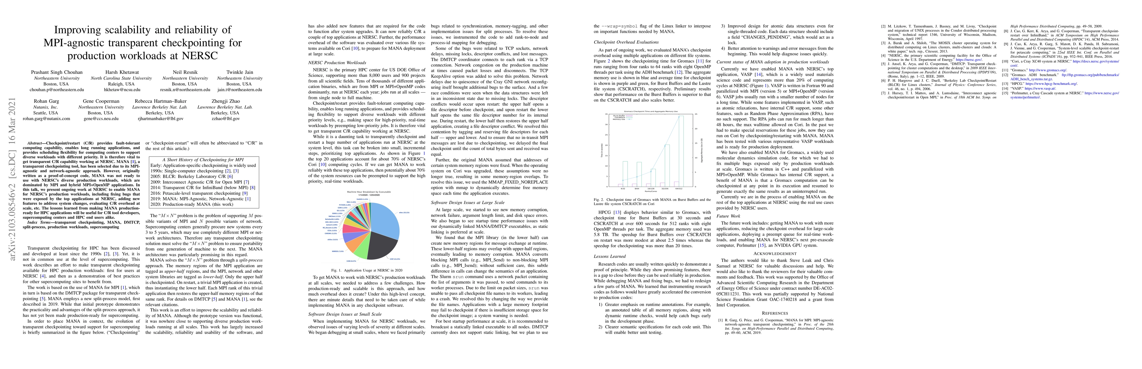 The research focuses on making MANA, a transparent checkpointing tool, production-ready for NERSC's diverse HPC workloads, which are dominated by MPI and hybrid MPI+OpenMP applications. This involves fixing bugs, adding new features, and evaluating C/R overhead at scale.