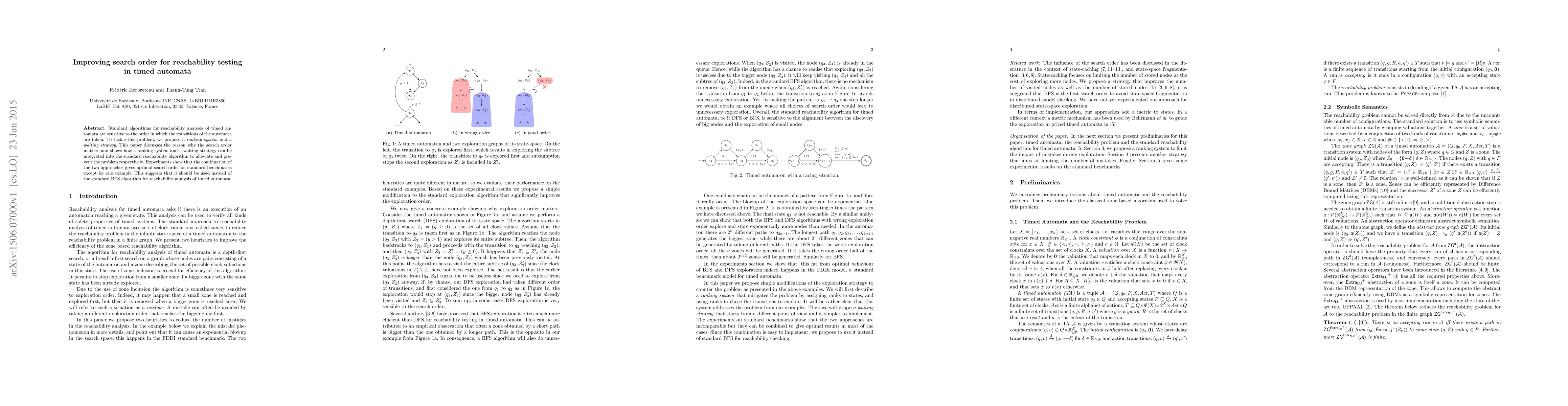 This paper proposes a ranking system and a waiting strategy to improve search order for reachability testing in timed automata, demonstrating their effectiveness in optimizing search efficiency over standard BFS algorithms, with optimal results on standard benchmarks except for one case.