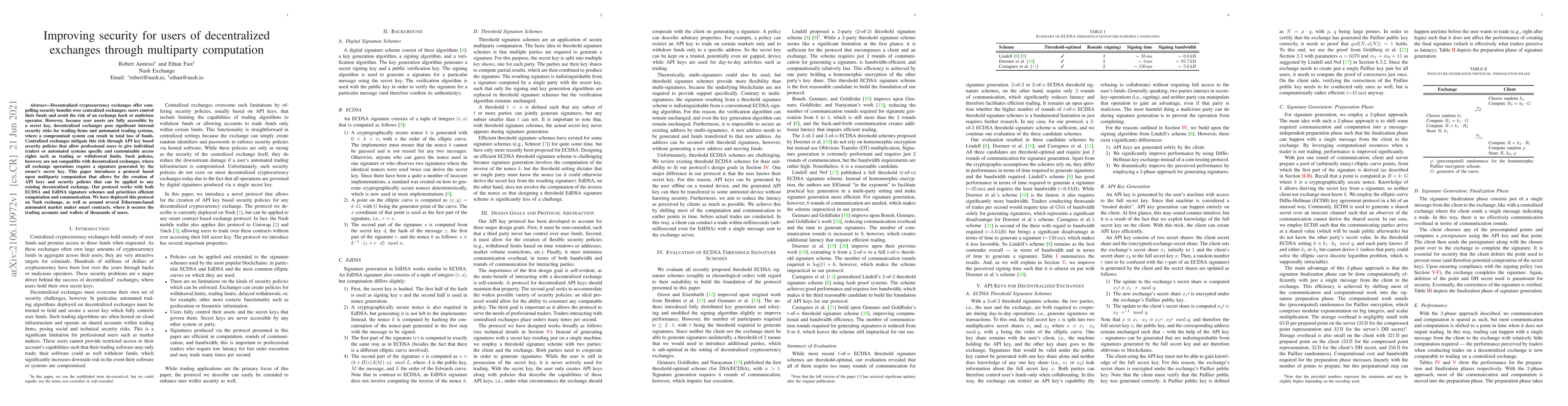 This paper proposes a multiparty computation protocol to enhance security for decentralized cryptocurrency exchanges by enabling customizable API key-based security policies, addressing the risk of compromised systems leading to total fund loss. The protocol is deployed on Nash exchange and Ethereum-based smart contracts, securing user accounts and wallets.
