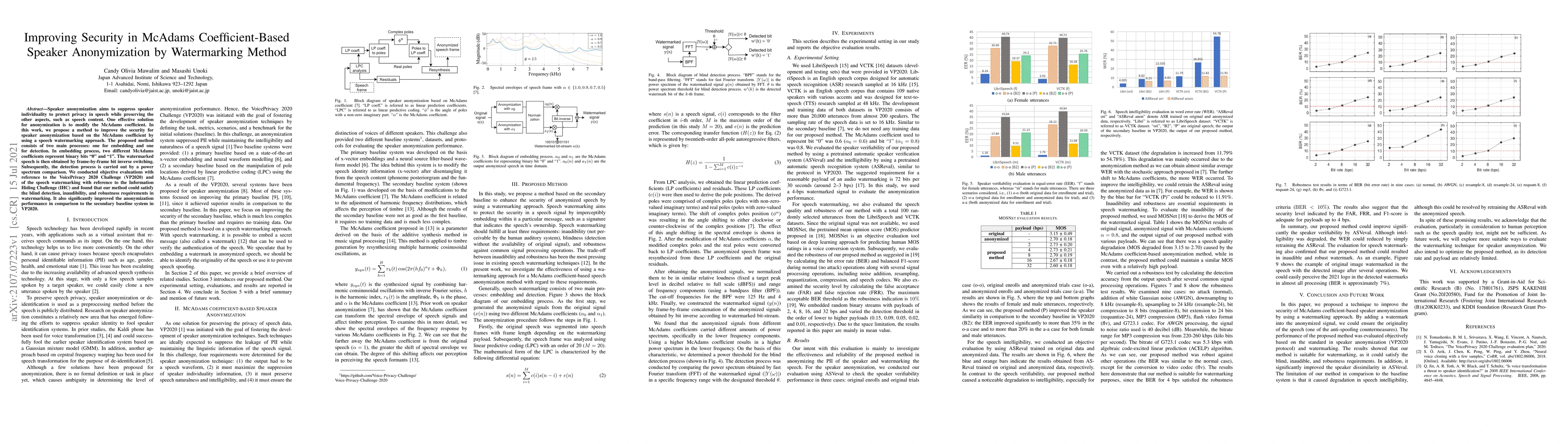 Speaker anonymization aims to suppress speaker individuality to protect privacy in speech while preserving the other aspects, such as speech content. One effective solution for anonymization is to modify the McAdams coefficient. In this work, we propose a method to improve the security for speaker anonymization based on the McAdams coefficient by using a speech watermarking approach. The proposed method consists of two main processes: one for embedding and one for detection. In embedding process, two different McAdams coefficients represent binary bits ``0" and ``1". The watermarked speech is then obtained by frame-by-frame bit inverse switching. Subsequently, the detection process is carried out by a power spectrum comparison. We conducted objective evaluations with reference to the VoicePrivacy 2020 Challenge (VP2020) and of the speech watermarking with reference to the Information Hiding Challenge (IHC) and found that our method could satisfy the blind detection, inaudibility, and robustness requirements in watermarking. It also significantly improved the anonymization performance in comparison to the secondary baseline system in VP2020.