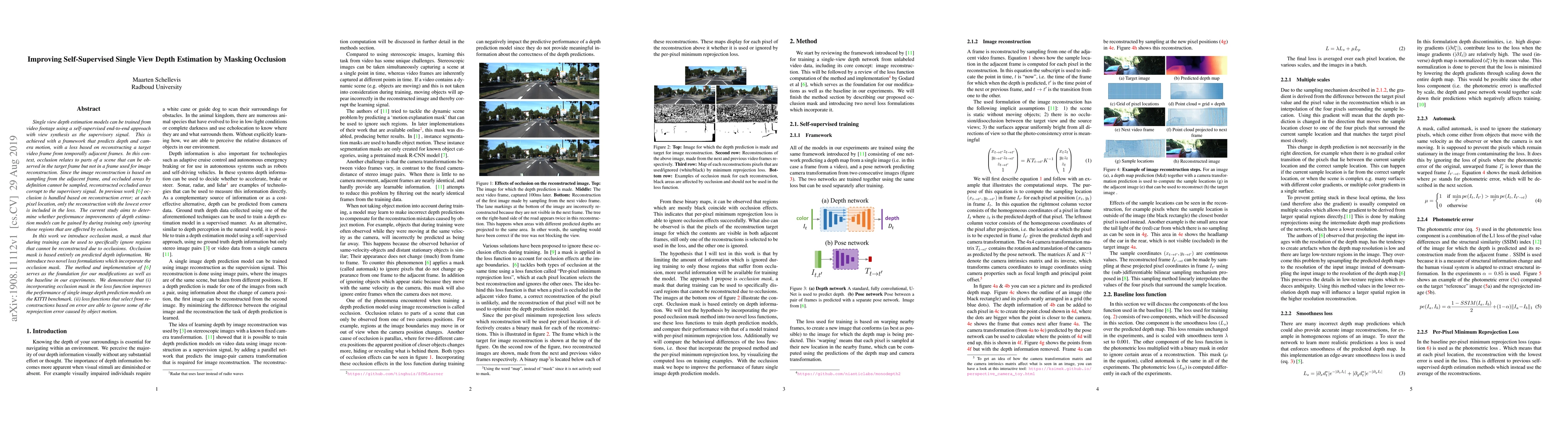 This study improves single view depth estimation by introducing an occlusion mask to ignore regions affected by occlusions during training, leading to improved performance on the KITTI benchmark.