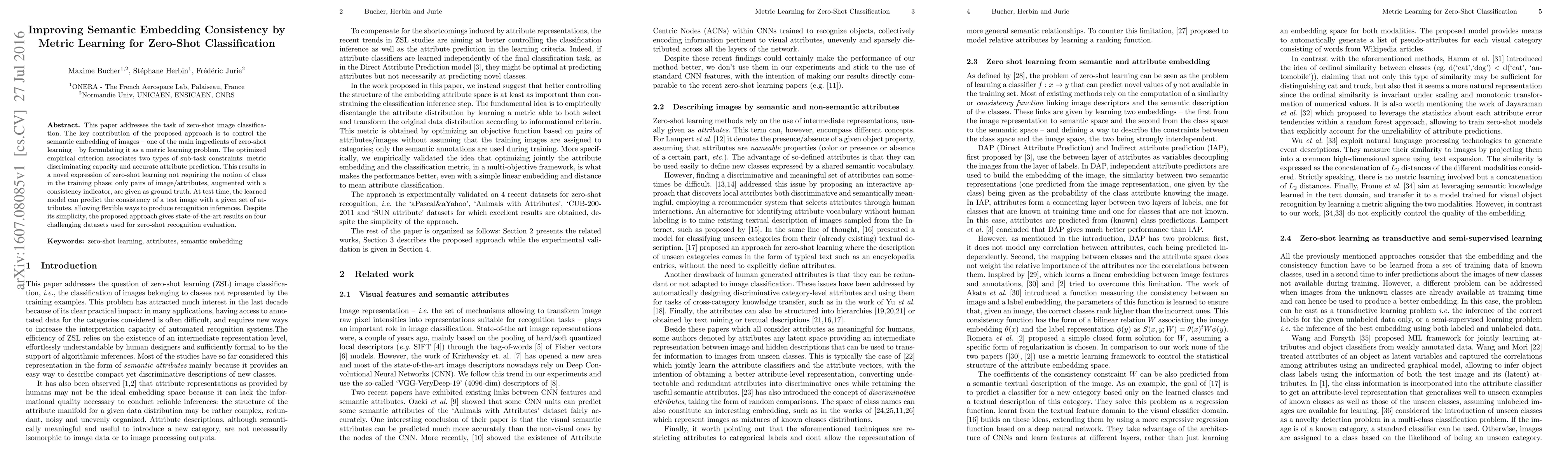 This paper proposes a new approach to zero-shot image classification that controls semantic embeddings through metric learning, achieving state-of-the-art results on four challenging datasets.