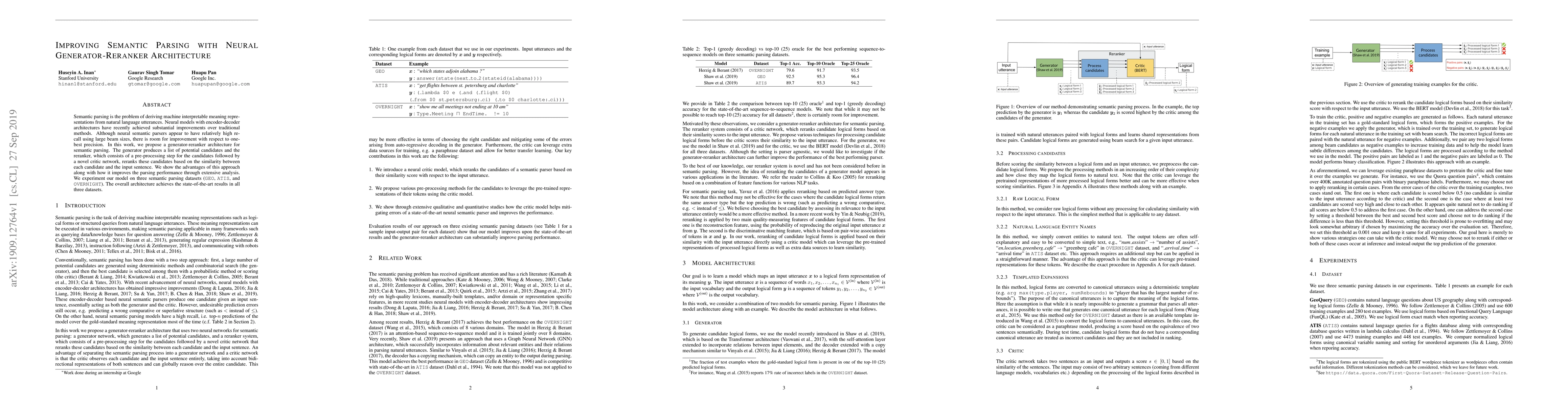 This research introduces a neural generator-reranker architecture for semantic parsing, which produces multiple candidate meaning representations and employs a critic network to rerank them, significantly enhancing parsing performance and achieving state-of-the-art results on three datasets: GEO, ATIS, and OVERNIGHT.
