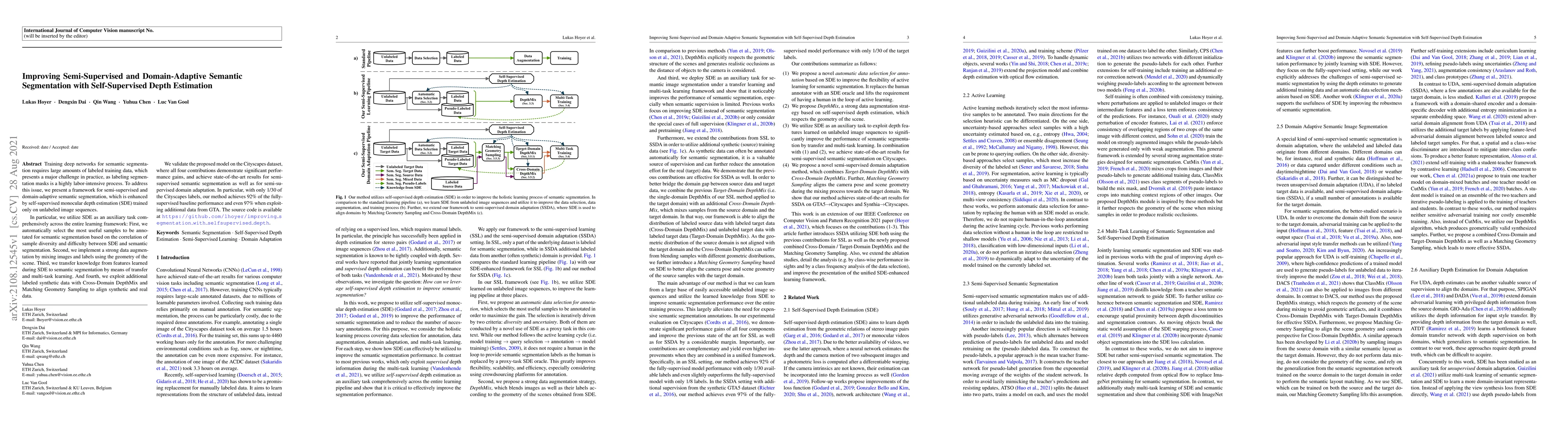 This paper proposes a framework for semi-supervised and domain-adaptive semantic segmentation enhanced by self-supervised depth estimation. It achieves significant performance gains through sample selection, data augmentation, transfer learning, and synthetic data alignment, achieving state-of-the-art results on the Cityscapes dataset.