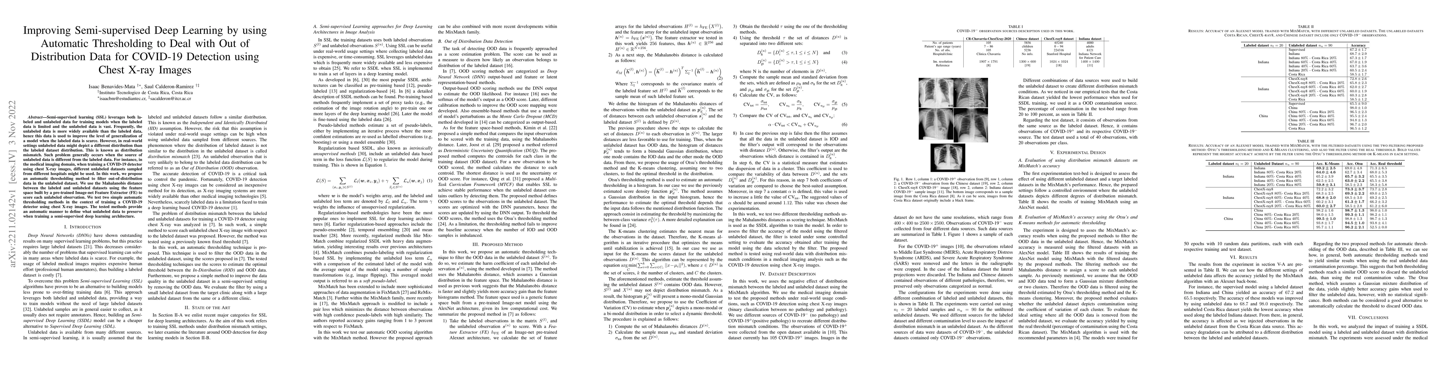 Semi-supervised learning (SSL) leverages both labeled and unlabeled data for training models when the labeled data is limited and the unlabeled data is vast. Frequently, the unlabeled data is more widely available than the labeled data, hence this data is used to improve the level of generalization of a model when the labeled data is scarce. However, in real-world settings unlabeled data might depict a different distribution than the labeled dataset distribution. This is known as distribution mismatch. Such problem generally occurs when the source of unlabeled data is different from the labeled data. For instance, in the medical imaging domain, when training a COVID-19 detector using chest X-ray images, different unlabeled datasets sampled from different hospitals might be used. In this work, we propose an automatic thresholding method to filter out-of-distribution data in the unlabeled dataset. We use the Mahalanobis distance between the labeled and unlabeled datasets using the feature space built by a pre-trained Image-net Feature Extractor (FE) to score each unlabeled observation. We test two simple automatic thresholding methods in the context of training a COVID-19 detector using chest X-ray images. The tested methods provide an automatic manner to define what unlabeled data to preserve when training a semi-supervised deep learning architecture.