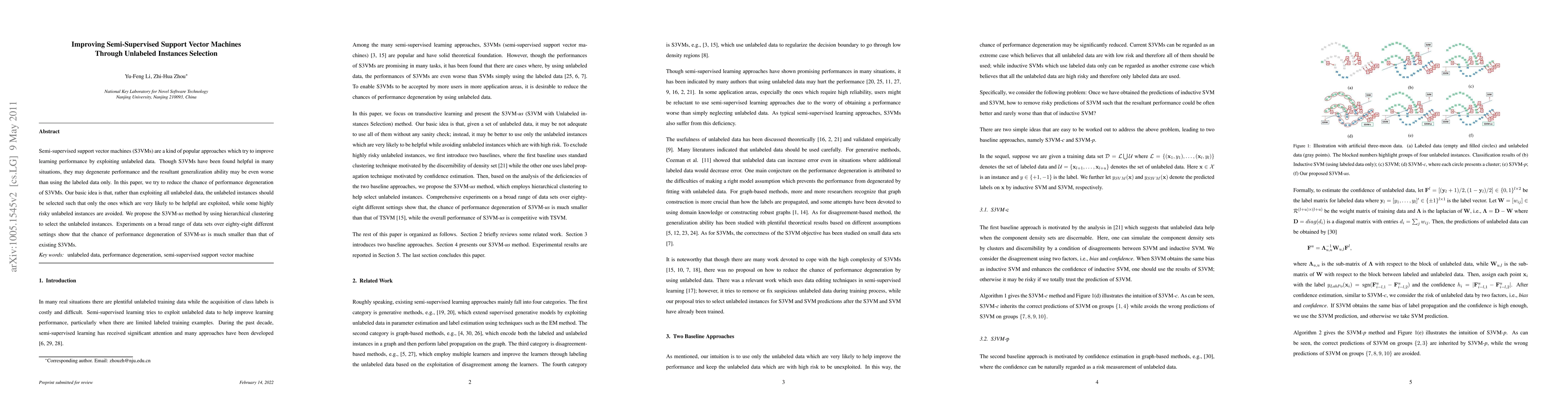 This paper proposes the S3VM-us method to improve semi-supervised support vector machines by selectively using unlabeled instances through hierarchical clustering. Experiments demonstrate that S3VM-us significantly reduces the risk of performance degeneration compared to existing semi-supervised methods.