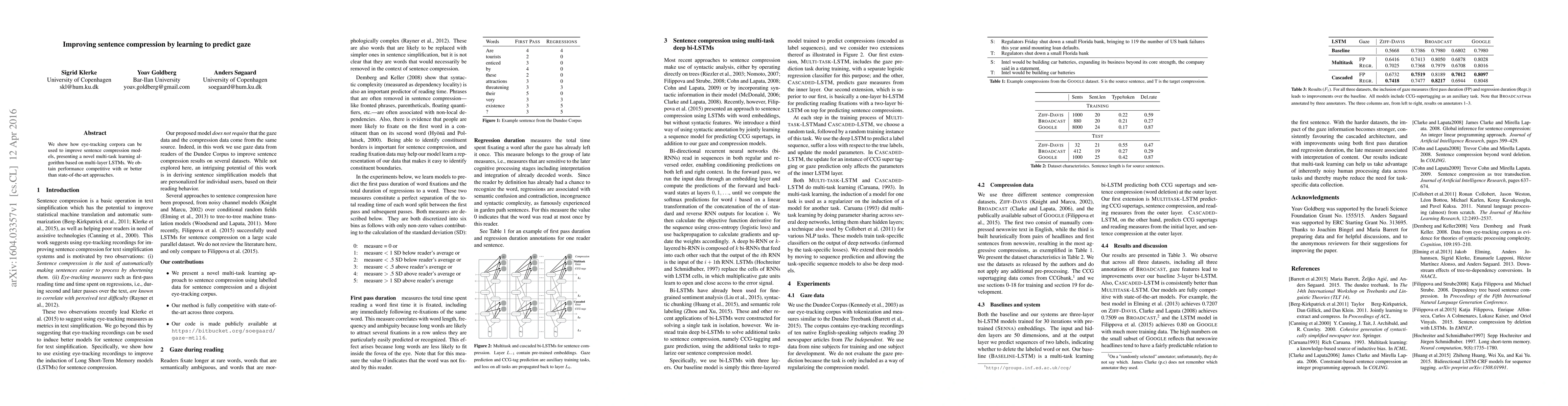 We show how eye-tracking corpora can be used to improve sentence compression models, presenting a novel multi-task learning algorithm based on multi-layer LSTMs. We obtain performance competitive with or better than state-of-the-art approaches.