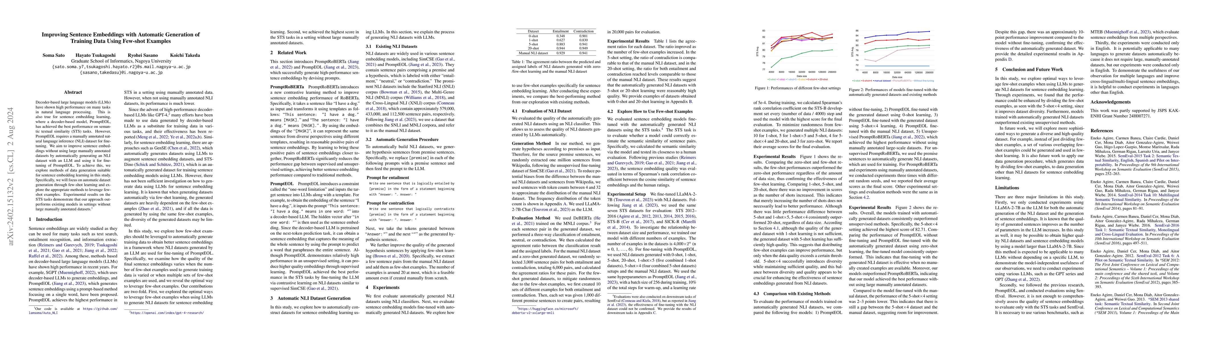 This paper proposes a method to enhance sentence embeddings in an unsupervised setting by generating an automatic natural language inference (NLI) dataset using a large language model, which is then used to fine-tune PromptEOL. The approach achieves a Spearman's rank correlation coefficient of 82.21, outperforming existing methods that rely on manually annotated datasets.