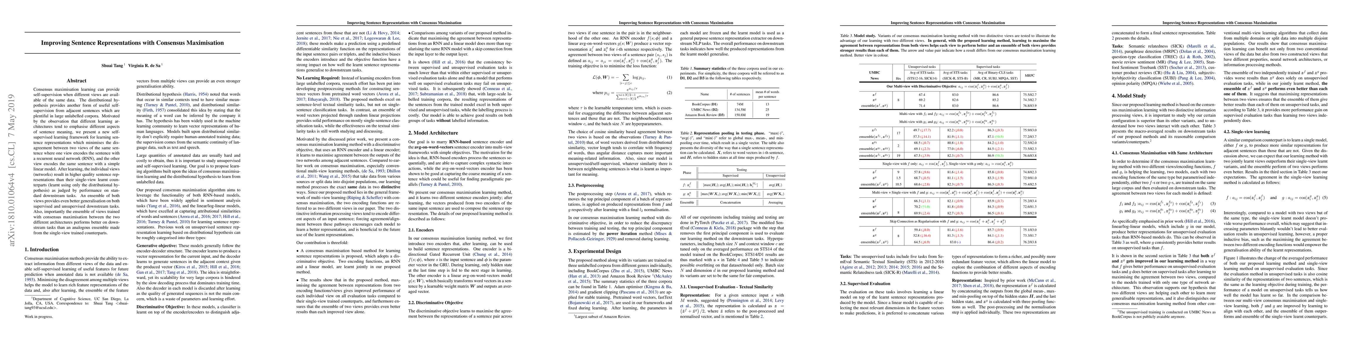 This research introduces a self-supervised learning framework for sentence representations using consensus maximisation. It employs two different architectures: a recurrent neural network (RNN) and a linear model to encode the same sentence. The method improves individual view quality and ensemble performance on both supervised and unsupervised tasks, outperforming single-view trained counterparts.