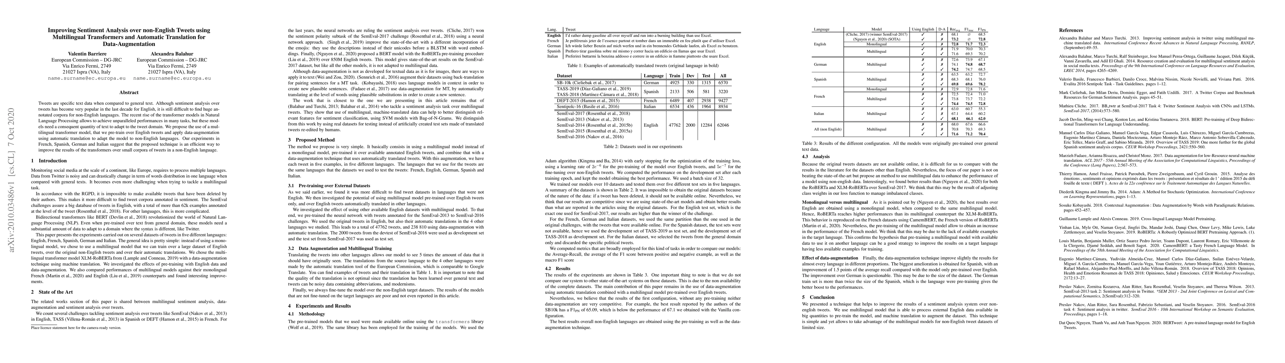 This paper proposes using a multilingual transformer model pre-trained on English tweets and augmented with automatic translation to improve sentiment analysis for non-English tweets. Experiments show the technique effectively enhances performance on small corpora in French, Spanish, German, and Italian.