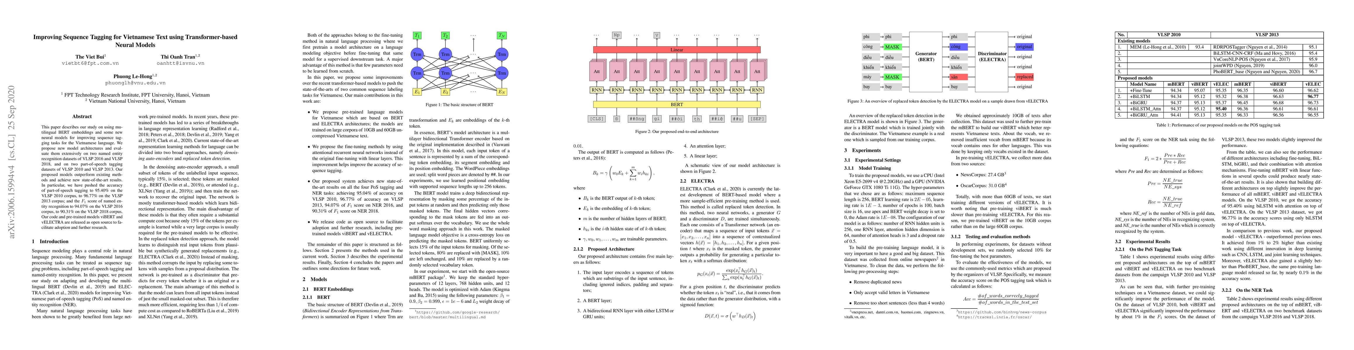 This paper describes our study on using mutilingual BERT embeddings and some new neural models for improving sequence tagging tasks for the Vietnamese language. We propose new model architectures and evaluate them extensively on two named entity recognition datasets of VLSP 2016 and VLSP 2018, and on two part-of-speech tagging datasets of VLSP 2010 and VLSP 2013. Our proposed models outperform existing methods and achieve new state-of-the-art results. In particular, we have pushed the accuracy of part-of-speech tagging to 95.40% on the VLSP 2010 corpus, to 96.77% on the VLSP 2013 corpus; and the F1 score of named entity recognition to 94.07% on the VLSP 2016 corpus, to 90.31% on the VLSP 2018 corpus. Our code and pre-trained models viBERT and vELECTRA are released as open source to facilitate adoption and further research.