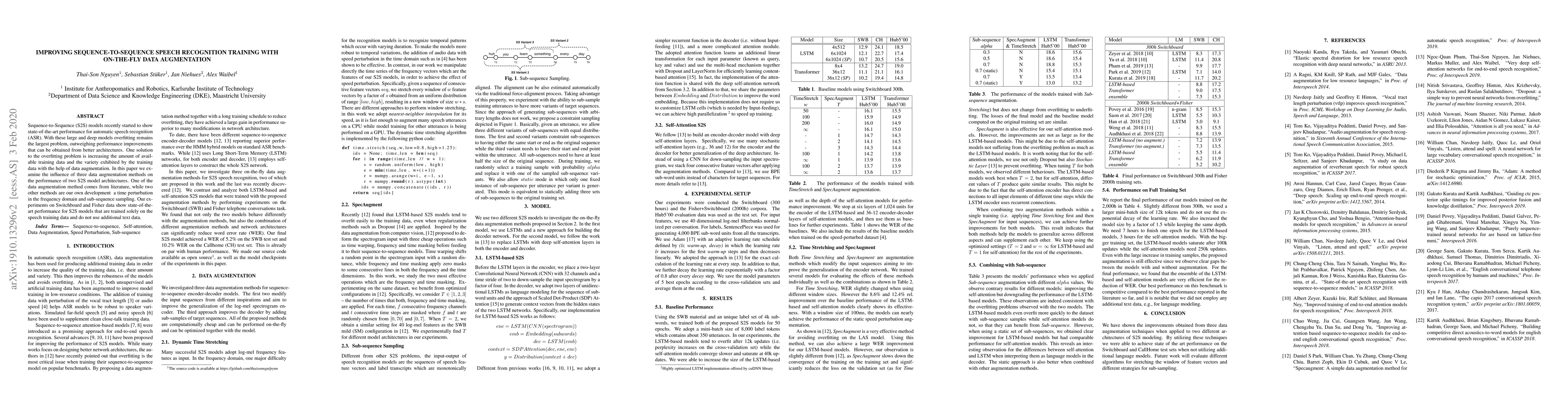 Sequence-to-Sequence (S2S) models recently started to show state-of-the-art performance for automatic speech recognition (ASR). With these large and deep models overfitting remains the largest problem, outweighing performance improvements that can be obtained from better architectures. One solution to the overfitting problem is increasing the amount of available training data and the variety exhibited by the training data with the help of data augmentation. In this paper we examine the influence of three data augmentation methods on the performance of two S2S model architectures. One of the data augmentation method comes from literature, while two other methods are our own development - a time perturbation in the frequency domain and sub-sequence sampling. Our experiments on Switchboard and Fisher data show state-of-the-art performance for S2S models that are trained solely on the speech training data and do not use additional text data.