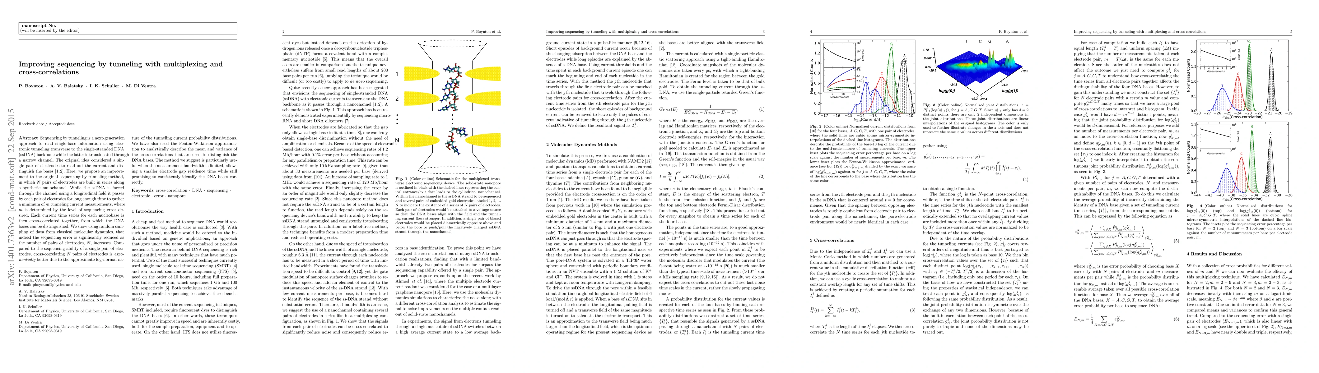 Sequencing by tunneling is a next-generation approach to read single-base information using electronic tunneling transverse to the single-stranded DNA (ssDNA) backbone while the latter is translocated through a narrow channel. The original idea considered a single pair of electrodes to read out the current and distinguish the bases [1, 2]. Here, we propose an improvement to the original sequencing by tunneling method, in which $N$ pairs of electrodes are built in series along a synthetic nanochannel. While the ssDNA is forced through the channel using a longitudinal field it passes by each pair of electrodes for long enough time to gather a minimum of $m$ tunneling current measurements, where $m$ is determined by the level of sequencing error desired. Each current time series for each nucleobase is then cross-correlated together, from which the DNA bases can be distinguished. We show using random sampling of data from classical molecular dynamics, that indeed the sequencing error is significantly reduced as the number of pairs of electrodes, $N$, increases. Compared to the sequencing ability of a single pair of electrodes, cross-correlating $N$ pairs of electrodes is exponentially better due to the approximate log-normal nature of the tunneling current probability distributions. We have also used the Fenton-Wilkinson approximation to analytically describe the mean and variance of the cross-correlations that are used to distinguish the DNA bases. The method we suggest is particularly useful when the measurement bandwidth is limited, allowing a smaller electrode gap residence time while still promising to consistently identify the DNA bases correctly.