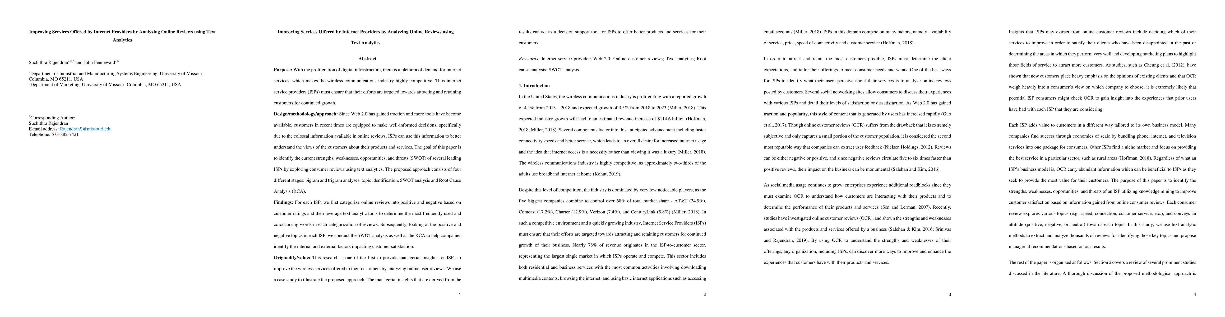 This paper uses text analytics to help internet service providers (ISPs) improve their services by analyzing customer reviews, identifying strengths, weaknesses, opportunities, and threats.