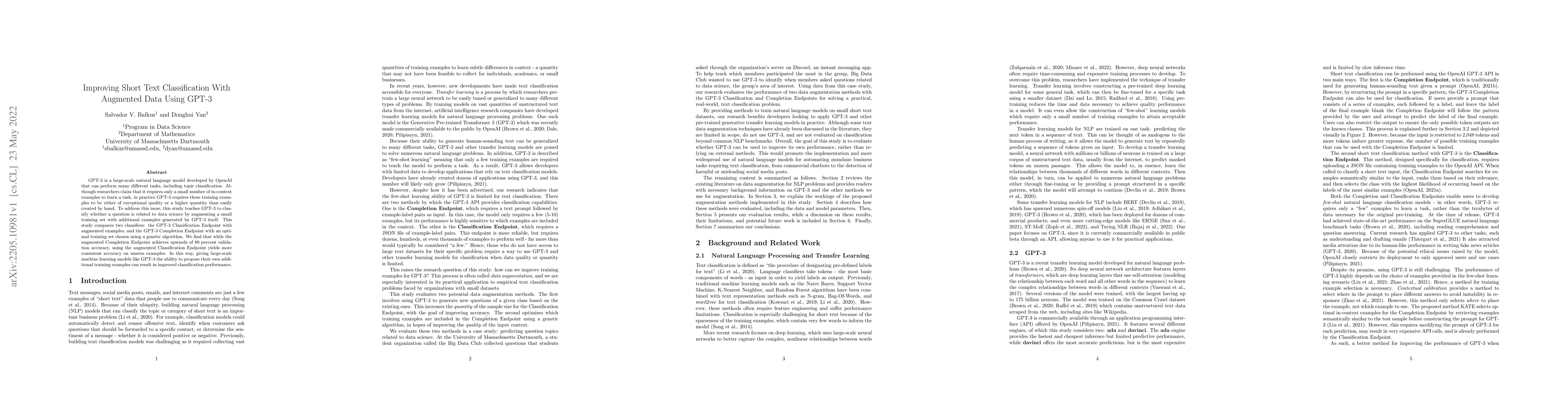 This study explores enhancing short text classification using GPT-3 by augmenting a small training set with examples generated by GPT-3 itself. The results show that the augmented Classification Endpoint of GPT-3 achieves more consistent accuracy on unseen data compared to the Completion Endpoint, suggesting that self-generated training can improve classification performance.