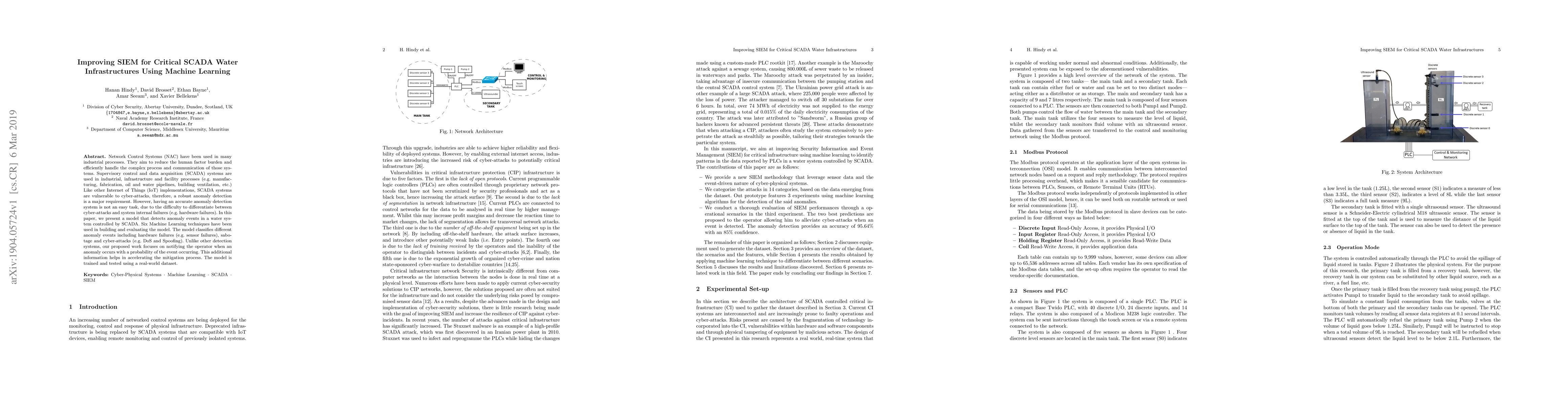 Network Control Systems (NAC) have been used in many industrial processes. They aim to reduce the human factor burden and efficiently handle the complex process and communication of those systems. Supervisory control and data acquisition (SCADA) systems are used in industrial, infrastructure and facility processes (e.g. manufacturing, fabrication, oil and water pipelines, building ventilation, etc.) Like other Internet of Things (IoT) implementations, SCADA systems are vulnerable to cyber-attacks, therefore, a robust anomaly detection is a major requirement. However, having an accurate anomaly detection system is not an easy task, due to the difficulty to differentiate between cyber-attacks and system internal failures (e.g. hardware failures). In this paper, we present a model that detects anomaly events in a water system controlled by SCADA. Six Machine Learning techniques have been used in building and evaluating the model. The model classifies different anomaly events including hardware failures (e.g. sensor failures), sabotage and cyber-attacks (e.g. DoS and Spoofing). Unlike other detection systems, our proposed work focuses on notifying the operator when an anomaly occurs with a probability of the event occurring. This additional information helps in accelerating the mitigation process. The model is trained and tested using a real-world dataset.