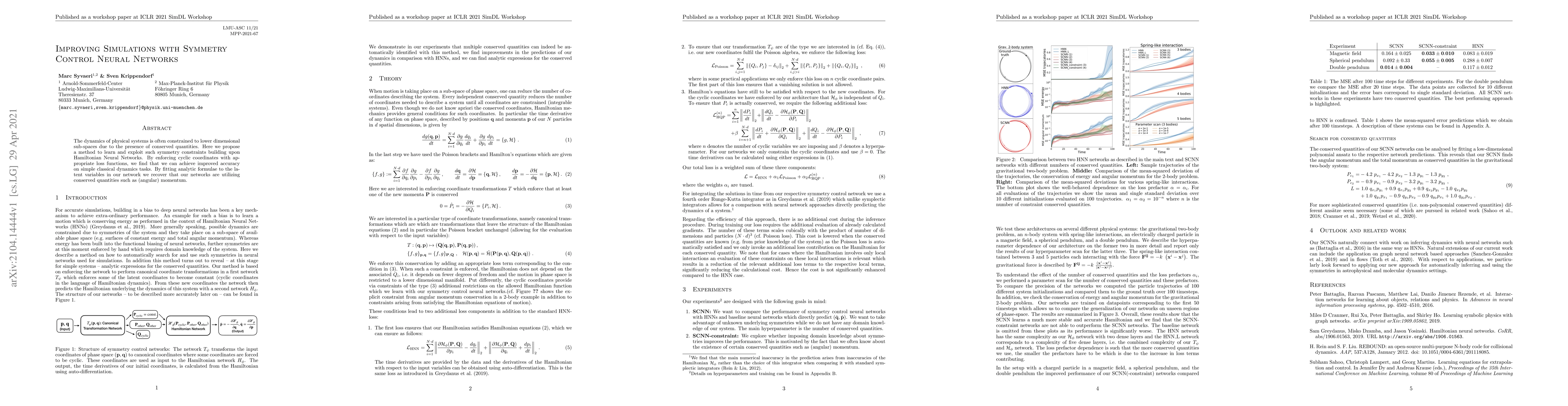 This paper proposes a method to enhance simulations using symmetry control neural networks that leverage Hamiltonian Neural Networks. By enforcing cyclic coordinates through tailored loss functions, the approach achieves higher accuracy in classical dynamics tasks, demonstrating the networks' utilization of conserved quantities like momentum.