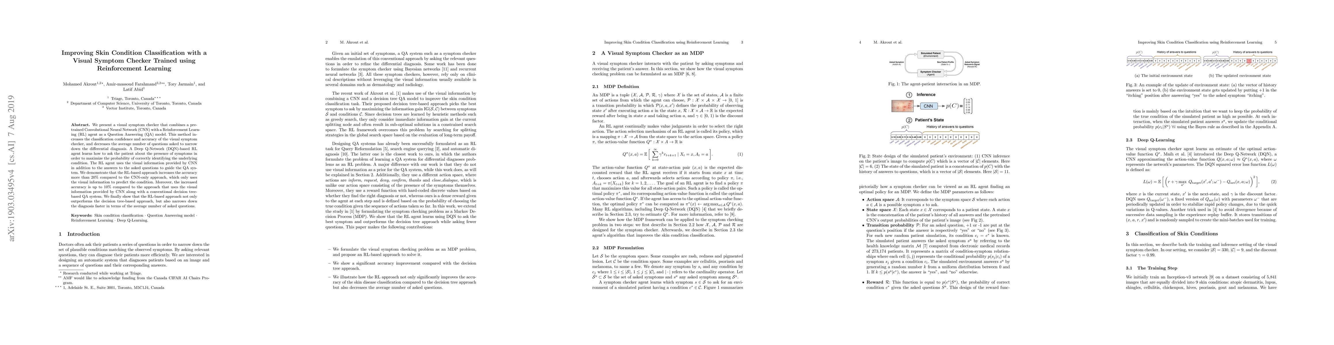 A visual symptom checker using a Convolutional Neural Network (CNN) with Reinforcement Learning (RL) improves skin condition classification accuracy by 20-10% compared to CNN-only and conventional decision tree-based approaches.