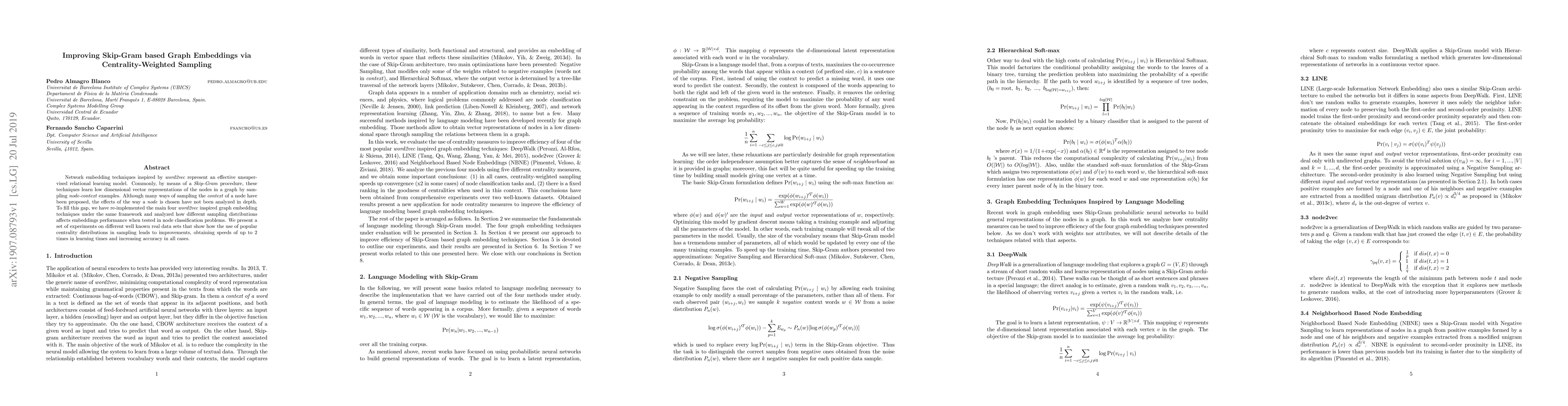 This paper investigates how centrality-weighted sampling improves Skip-Gram based graph embeddings, demonstrating that using centrality distributions in sampling enhances node classification performance, reduces learning times, and increases accuracy across various datasets.