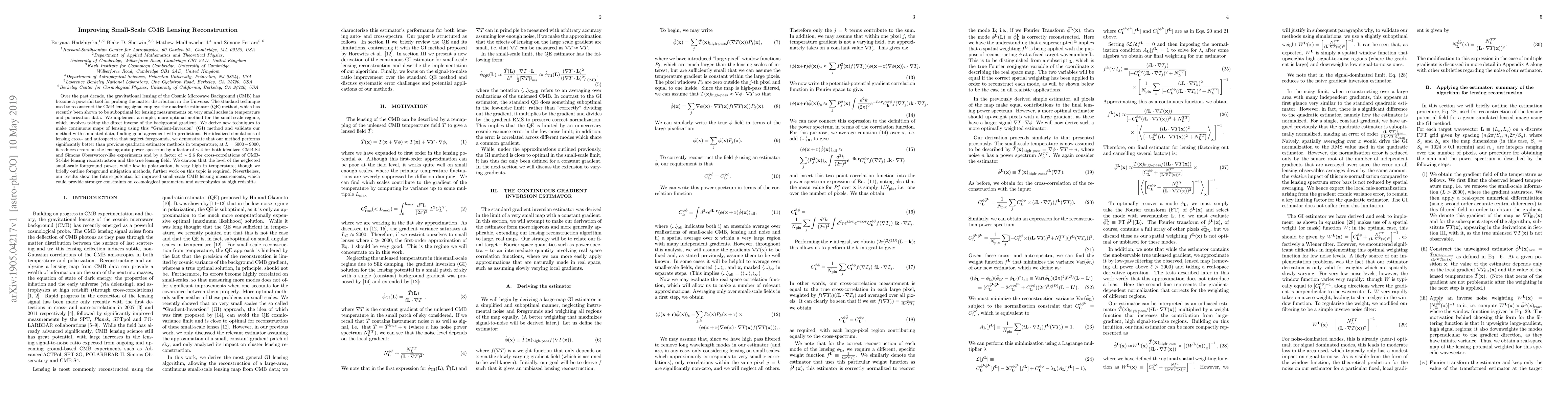 This paper introduces a new "Gradient-Inversion" (GI) method for reconstructing small-scale CMB lensing, which outperforms the traditional quadratic estimator (QE) method, especially at high multipoles ($L=5000-9000$). The GI method reduces lensing auto-power spectrum errors by a factor of $\sim 4$ for future CMB experiments, though challenges remain due to high foreground noise in temperature data.