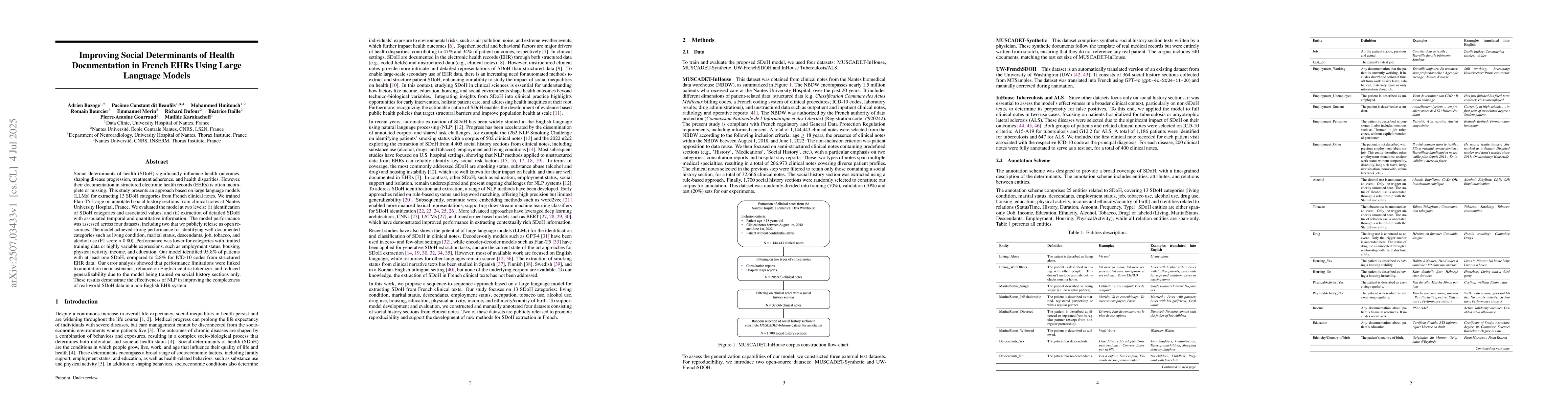 Social determinants of health (SDoH) significantly influence health outcomes, shaping disease progression, treatment adherence, and health disparities. However, their documentation in structured electronic health records (EHRs) is often incomplete or missing. This study presents an approach based on large language models (LLMs) for extracting 13 SDoH categories from French clinical notes. We trained Flan-T5-Large on annotated social history sections from clinical notes at Nantes University Hospital, France. We evaluated the model at two levels: (i) identification of SDoH categories and associated values, and (ii) extraction of detailed SDoH with associated temporal and quantitative information. The model performance was assessed across four datasets, including two that we publicly release as open resources. The model achieved strong performance for identifying well-documented categories such as living condition, marital status, descendants, job, tobacco, and alcohol use (F1 score > 0.80). Performance was lower for categories with limited training data or highly variable expressions, such as employment status, housing, physical activity, income, and education. Our model identified 95.8% of patients with at least one SDoH, compared to 2.8% for ICD-10 codes from structured EHR data. Our error analysis showed that performance limitations were linked to annotation inconsistencies, reliance on English-centric tokenizer, and reduced generalizability due to the model being trained on social history sections only. These results demonstrate the effectiveness of NLP in improving the completeness of real-world SDoH data in a non-English EHR system.