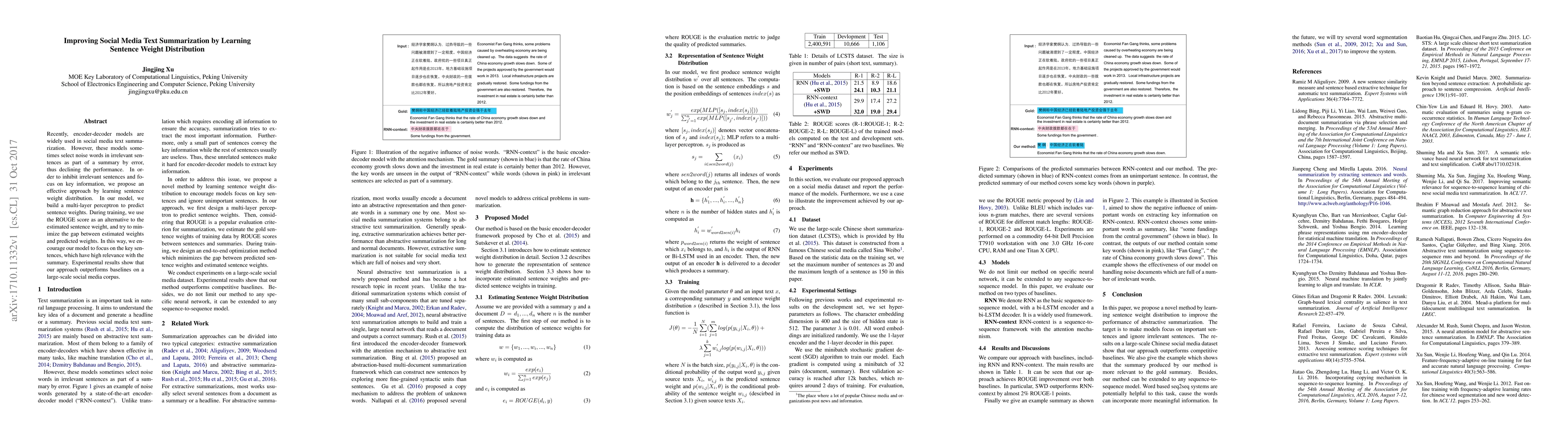 This paper proposes an approach to improve social media text summarization by learning sentence weight distribution to focus on key information. The model uses a multi-layer perceptron to predict sentence weights, minimizing the gap between estimated and predicted weights to enhance relevance, resulting in better summarization performance compared to baselines.