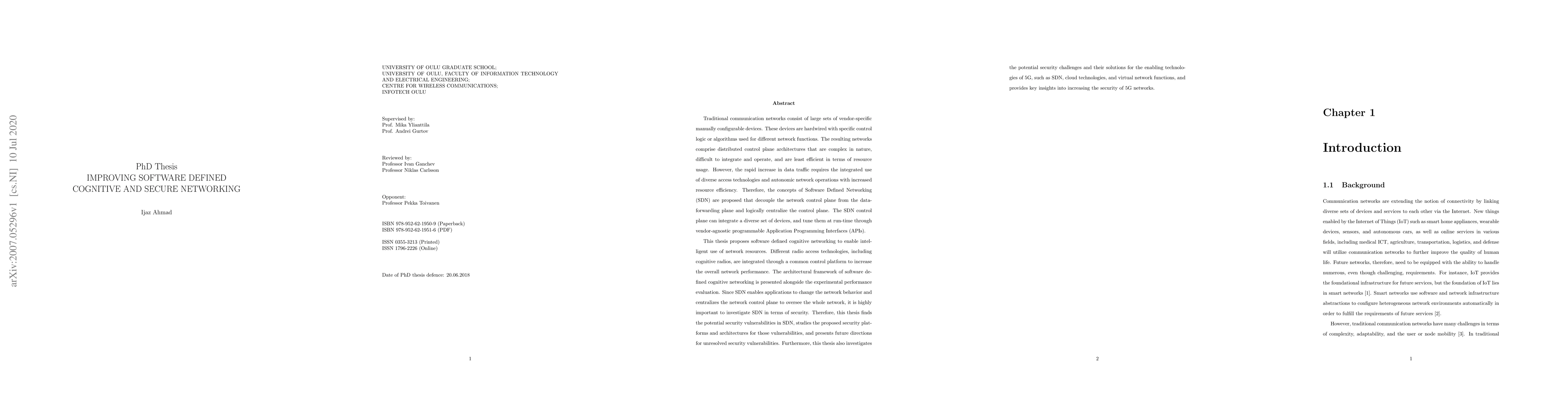 Traditional communication networks consist of large sets of vendor-specific manually configurable devices which are hardwired with specific control logic or algorithms. The resulting networks comprise distributed control plane architectures that are complex in nature, difficult to integrate and operate, and are least efficient in terms of resource usage. However, the rapid increase in data traffic requires an integrated use of diverse access technologies and autonomic network operations with increased efficiency. Therefore, the concepts of Software Defined Networking (SDN) are proposed that decouple the network control plane from the data-forwarding plane. The SDN control plane can integrate a diverse set of devices, and tune them at run-time through vendor-agnostic programmable Application Programming Interfaces (APIs). This thesis proposes software defined cognitive networking to enable intelligent use of network resources. Different radio access technologies, including cognitive radios, are integrated through a common control platform to increase the overall network performance. The architectural framework of software defined cognitive networking is presented alongside the experimental performance evaluation. Since SDN enables applications to change the network behavior and centralizes the network control plane to oversee the whole network, it is highly important to investigate security of SDNs. Therefore, this thesis finds potential security vulnerabilities in SDN, studies proposed security platforms and architectures for those vulnerabilities, and presents future directions for unresolved security vulnerabilities. Furthermore, this thesis also investigates the potential security challenges and their solutions for the enabling technologies of 5G, such as SDN, cloud technologies, and virtual network functions, and provides key insights into increasing the security of 5G networks.