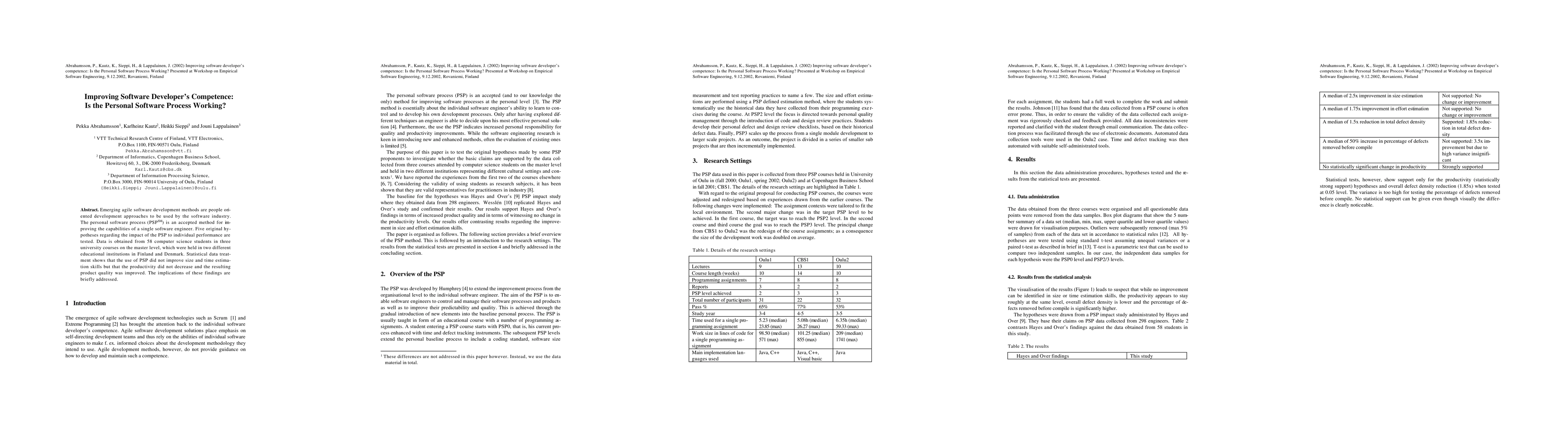 Emerging agile software development methods are people oriented development approaches to be used by the software industry. The personal software process (PSP) is an accepted method for improving the capabilities of a single software engineer. Five original hypotheses regarding the impact of the PSP to individual performance are tested. Data is obtained from 58 computer science students in three university courses on the master level, which were held in two different educational institutions in Finland and Denmark. Statistical data treatment shows that the use of PSP did not improve size and time estimation skills but that the productivity did not decrease and the resulting product quality was improved. The implications of these findings are briefly addressed.