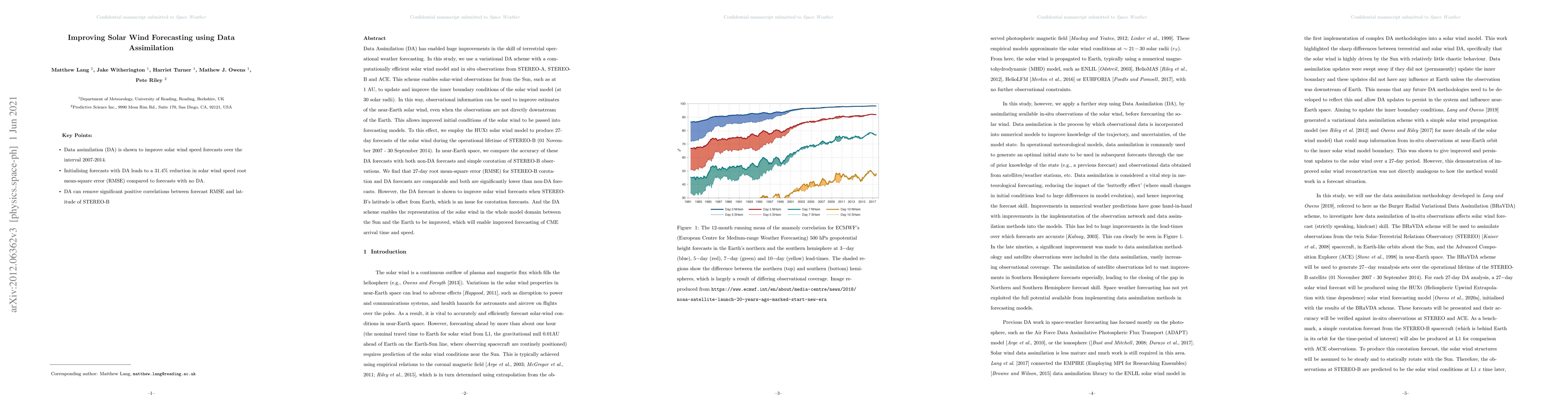 Data Assimilation (DA) has enabled huge improvements in the skill of terrestrial operational weather forecasting. In this study, we use a variational DA scheme with a computationally efficient solar wind model and in situ observations from STEREO-A, STEREO-B and ACE. This scheme enables solar-wind observations far from the Sun, such as at 1 AU, to update and improve the inner boundary conditions of the solar wind model (at 30 solar radii). In this way, observational information can be used to improve estimates of the near-Earth solar wind, even when the observations are not directly downstream of the Earth. This allows improved initial conditions of the solar wind to be passed into forecasting models. To this effect, we employ the HUXt solar wind model to produce 27-day forecasts of the solar wind during the operational lifetime of STEREO-B (01 November 2007 - 30 September 2014). In near-Earth space, we compare the accuracy of these DA forecasts with both non-DA forecasts and simple corotation of STEREO-B observations. We find that 27-day root mean-square error (RMSE) for STEREO-B corotation and DA forecasts are comparable and both are significantly lower than non-DA forecasts. However, the DA forecast is shown to improve solar wind forecasts when STEREO-B's latitude is offset from Earth, which is an issue for corotation forecasts. And the DA scheme enables the representation of the solar wind in the whole model domain between the Sun and the Earth to be improved, which will enable improved forecasting of CME arrival time and speed.