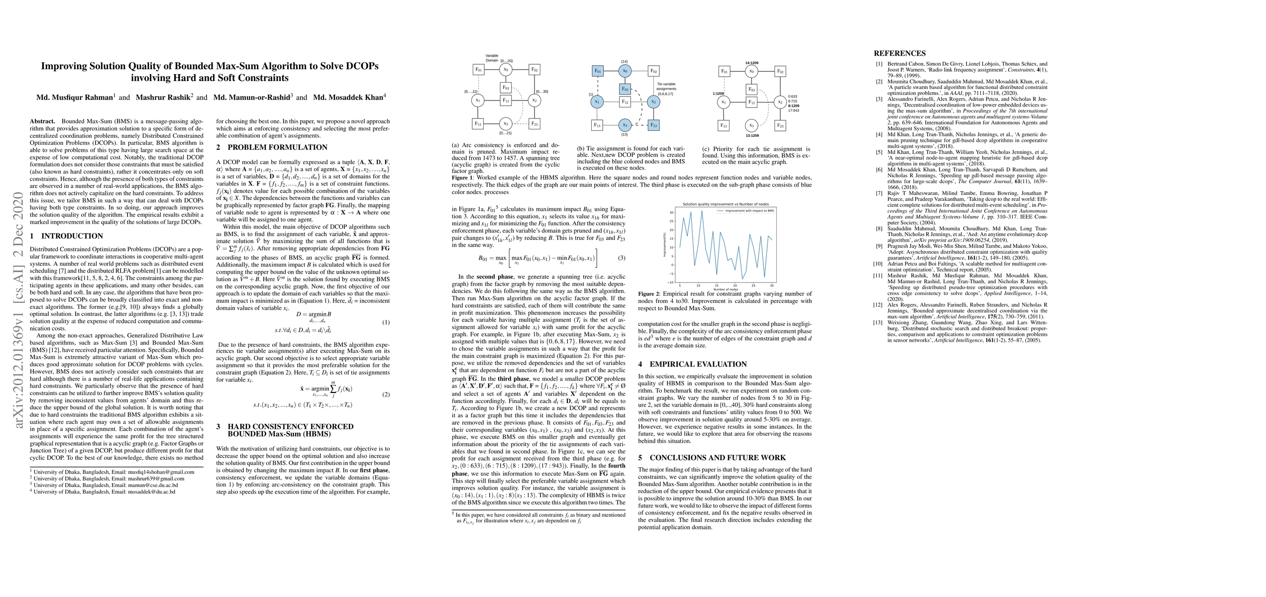 A research paper improves the solution quality of the Bounded Max-Sum algorithm to solve Distributed Constrained Optimization Problems (DCOPs) with both hard and soft constraints, achieving better results for large problems.