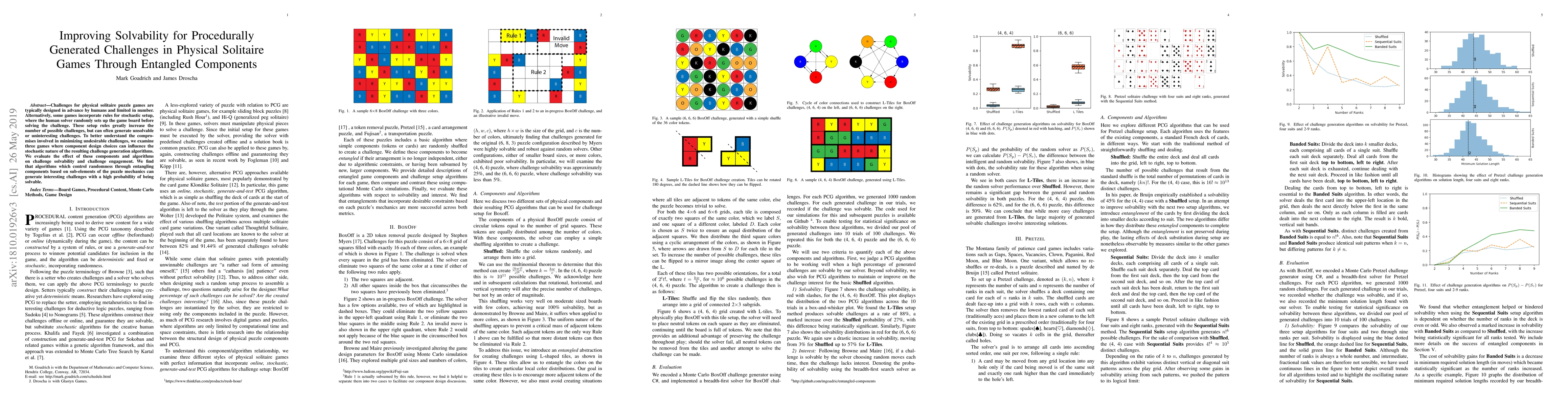 This paper explores procedurally generated challenges in physical solitaire games, focusing on how entangled components can enhance solvability. It finds that algorithms incorporating these components improve the likelihood of generating solvable and engaging challenges compared to purely random setups.