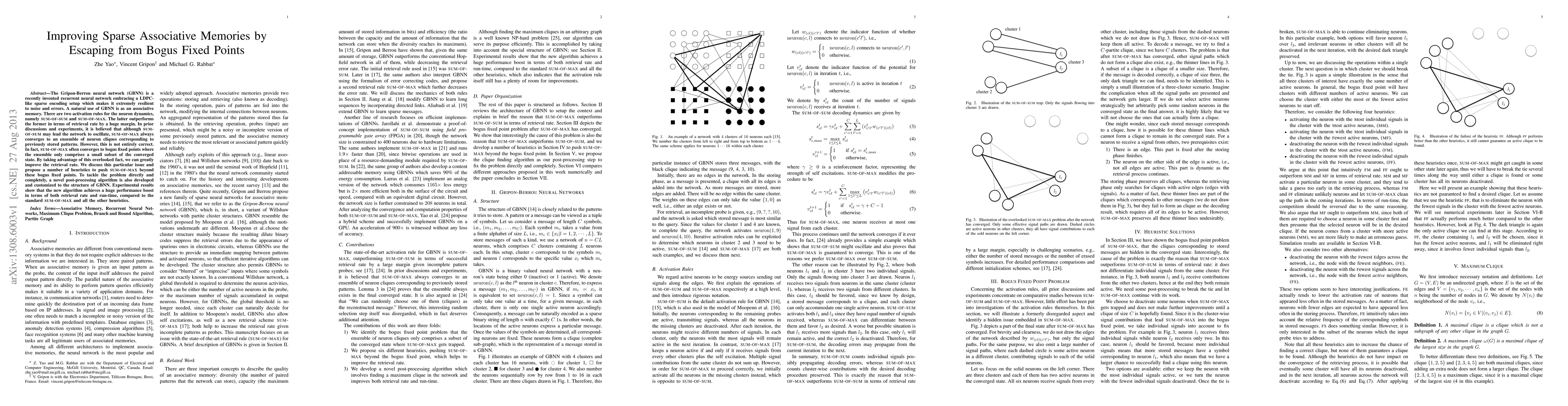 The Gripon-Berrou neural network (GBNN) is a recently invented recurrent neural network embracing a LDPC-like sparse encoding setup which makes it extremely resilient to noise and errors. A natural use of GBNN is as an associative memory. There are two activation rules for the neuron dynamics, namely sum-of-sum and sum-of-max. The latter outperforms the former in terms of retrieval rate by a huge margin. In prior discussions and experiments, it is believed that although sum-of-sum may lead the network to oscillate, sum-of-max always converges to an ensemble of neuron cliques corresponding to previously stored patterns. However, this is not entirely correct. In fact, sum-of-max often converges to bogus fixed points where the ensemble only comprises a small subset of the converged state. By taking advantage of this overlooked fact, we can greatly improve the retrieval rate. We discuss this particular issue and propose a number of heuristics to push sum-of-max beyond these bogus fixed points. To tackle the problem directly and completely, a novel post-processing algorithm is also developed and customized to the structure of GBNN. Experimental results show that the new algorithm achieves a huge performance boost in terms of both retrieval rate and run-time, compared to the standard sum-of-max and all the other heuristics.