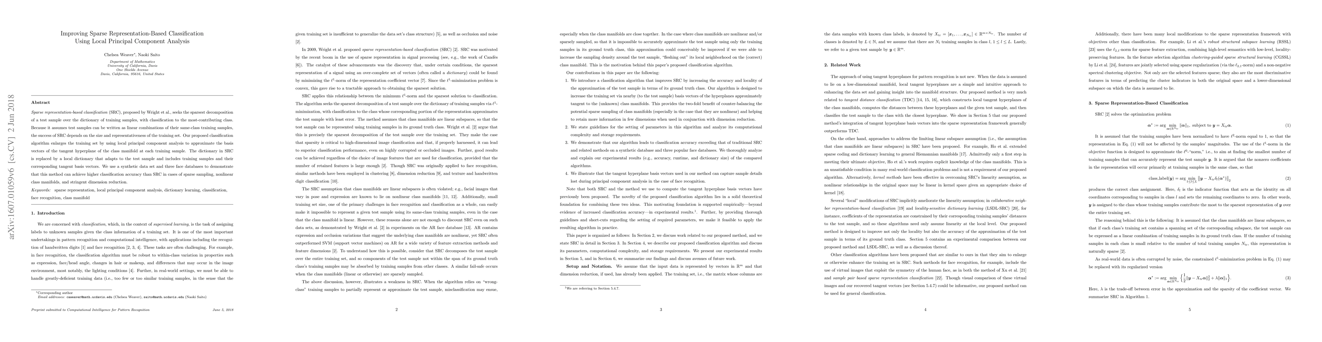 This paper proposes an enhanced sparse representation-based classification method using local principal component analysis to augment the training set, leading to improved classification accuracy, especially under sparse sampling and nonlinear class manifolds. The method replaces the global dictionary with a local dictionary that adapts to each test sample, demonstrating superior performance on synthetic and face datasets.