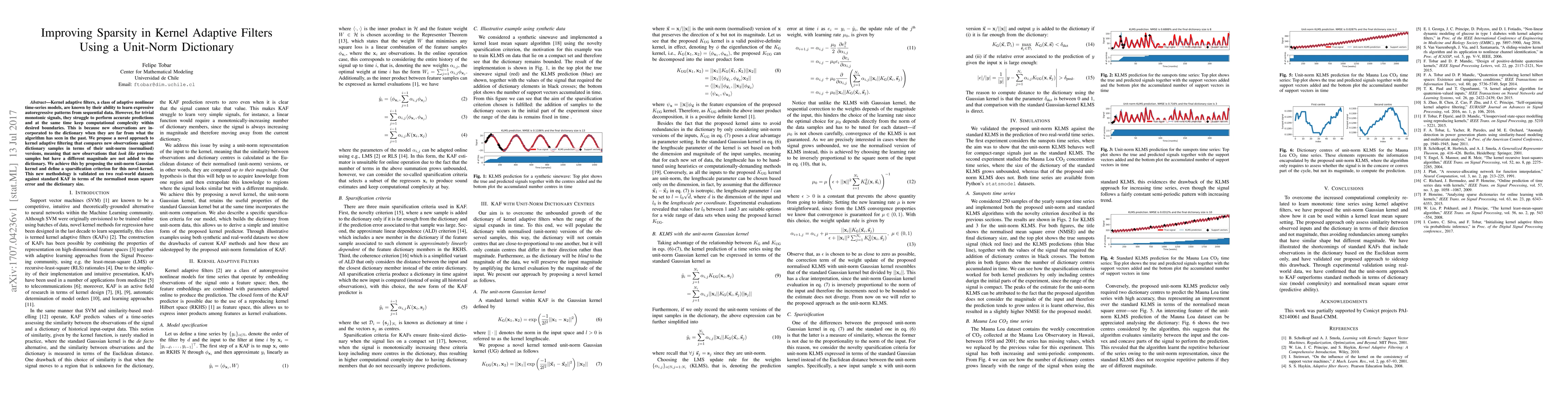 This paper proposes a novel kernel adaptive filtering method using a unit-norm dictionary to improve sparsity and prediction accuracy for monotonic signals. The unit-norm Gaussian kernel and a sparsification criterion are introduced to avoid adding scaled versions of previous samples, thus reducing computational complexity.